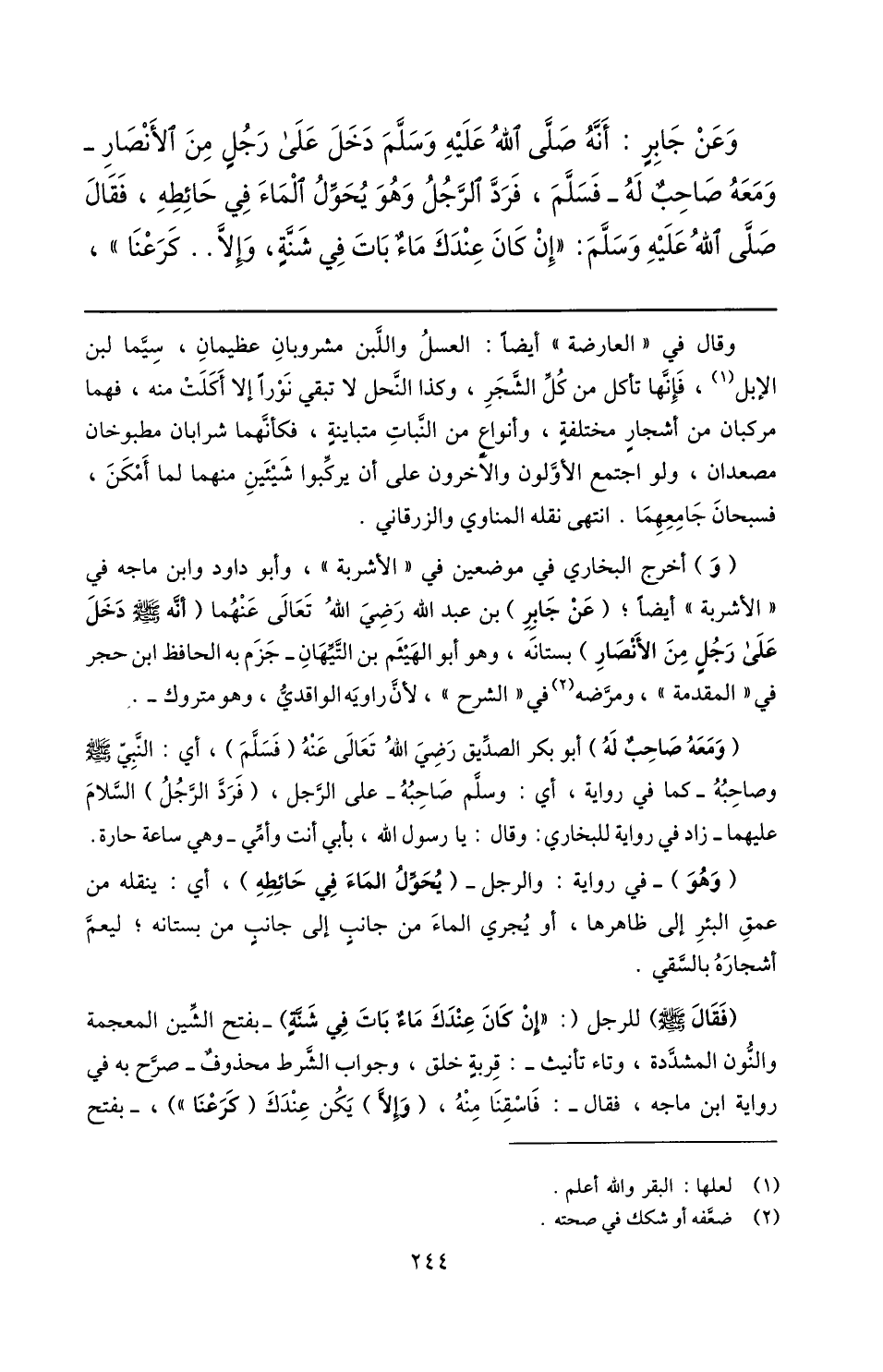 وعن جابر: أنّه صلّى الله عليه وسلّم دخل على رجل من الأنصار- ومعه صاحب له- فسلّم، فردّ الرّجل وهو يحوّل الماء في حائطه، فقال صلّى الله عليه وسلّم: «إن كان عندك ماء بات في شنّة، وإلّا.. كرعنا» ،