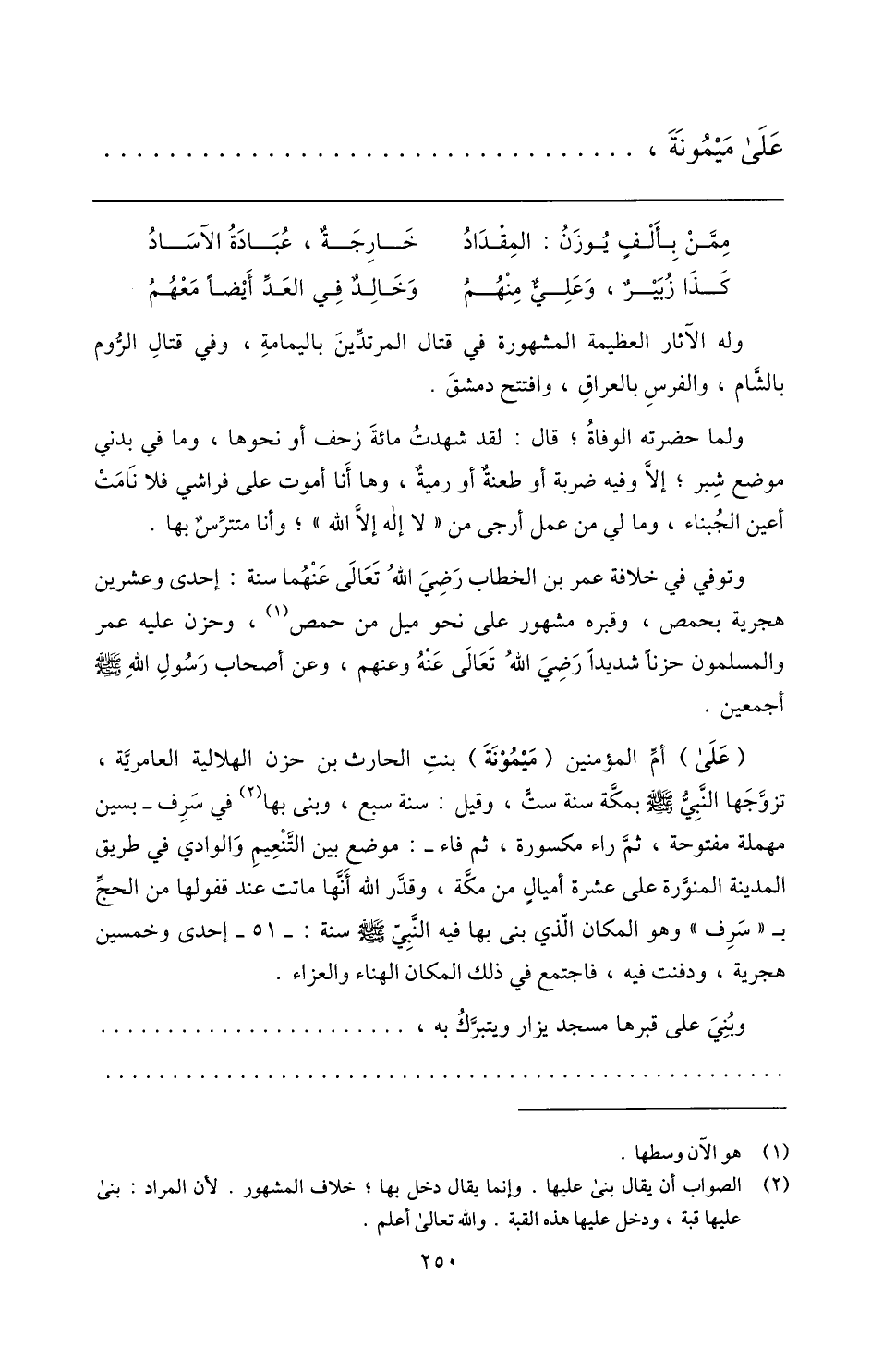 (على) أمّ المؤمنين (ميمونة) بنت الحارث بن حزن الهلالية العامريّة، تزوّجها النّبيّ صلّى الله عليه وسلم بمكّة سنة ستّ، وقيل: سنة سبع، وبنى بها «2» في سرف- بسين مهملة مفتوحة، ثمّ راء مكسورة، ثم فاء-: موضع بين التّنعيم والوادي في طريق المدينة المنوّرة على عشرة أميال من مكّة، وقدّر الله أنّها ماتت عند قفولها من الحجّ ب «سرف» وهو المكان الّذي بنى بها فيه النّبيّ صلّى الله عليه وسلم سنة: - 51- إحدى وخمسين هجرية، ودفنت فيه، فاجتمع في ذلك المكان الهناء والعزاء.