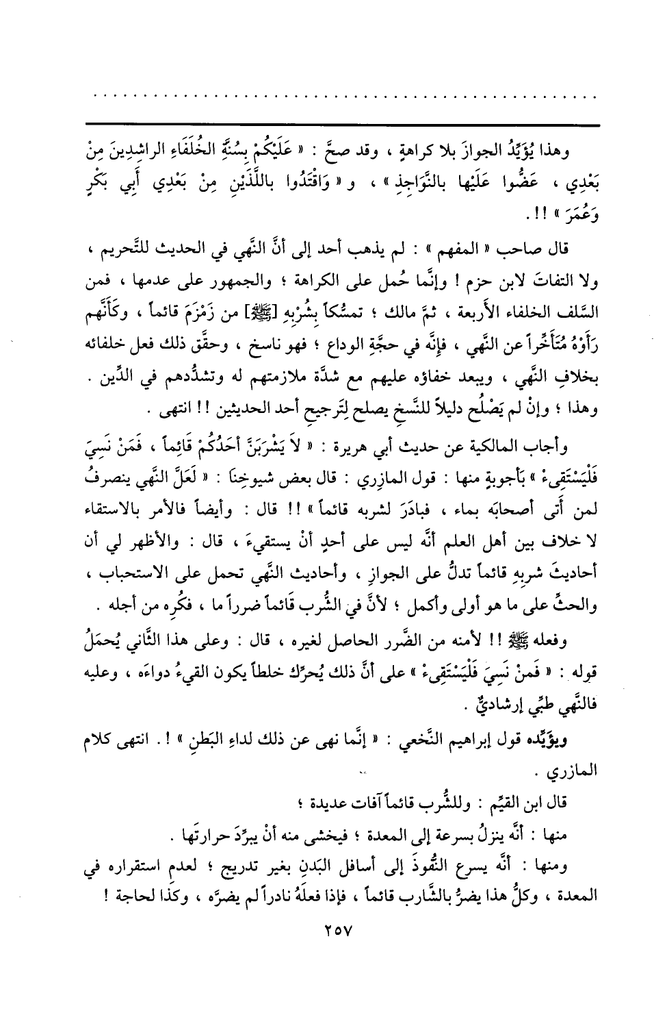قال صاحب «المفهم» : لم يذهب أحد إلى أنّ النّهي في الحديث للتّحريم، ولا التفات لابن حزم! وإنّما حمل على الكراهة؛ والجمهور على عدمها، فمن السّلف الخلفاء الأربعة، ثمّ مالك؛ تمسّكا بشربه [صلى الله عليه وسلم] من زمزم قائما، وكأنّهم رأوه متأخّرا عن النّهي، فإنّه في حجّة الوداع؛ فهو ناسخ، وحقّق ذلك فعل خلفائه بخلاف النّهي، ويبعد خفاؤه عليهم مع شدّة ملازمتهم له وتشدّدهم في الدّين.