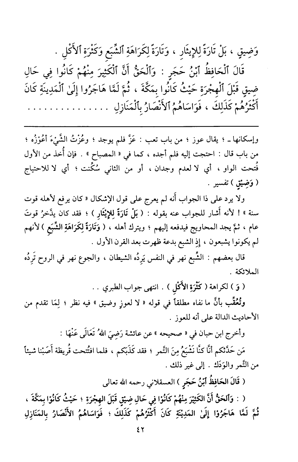 ولا يرد على ذا الجواب أنه لم يعرج على قول الإشكال «كان يرفع لأهله قوت سنة» ! لأنه أشار للجواب عنه بقوله: (بل تارة للإيثار) ؛ فقد كان يدّخر قوت عام، ثمّ يجد المحاويج فيدفعه إليهم؛ ويترك أهله، (وتارة لكراهة الشّبع) لأنهم لم يكونوا يشبعون، إذ الشبع بدعة ظهرت بعد القرن الأول.
