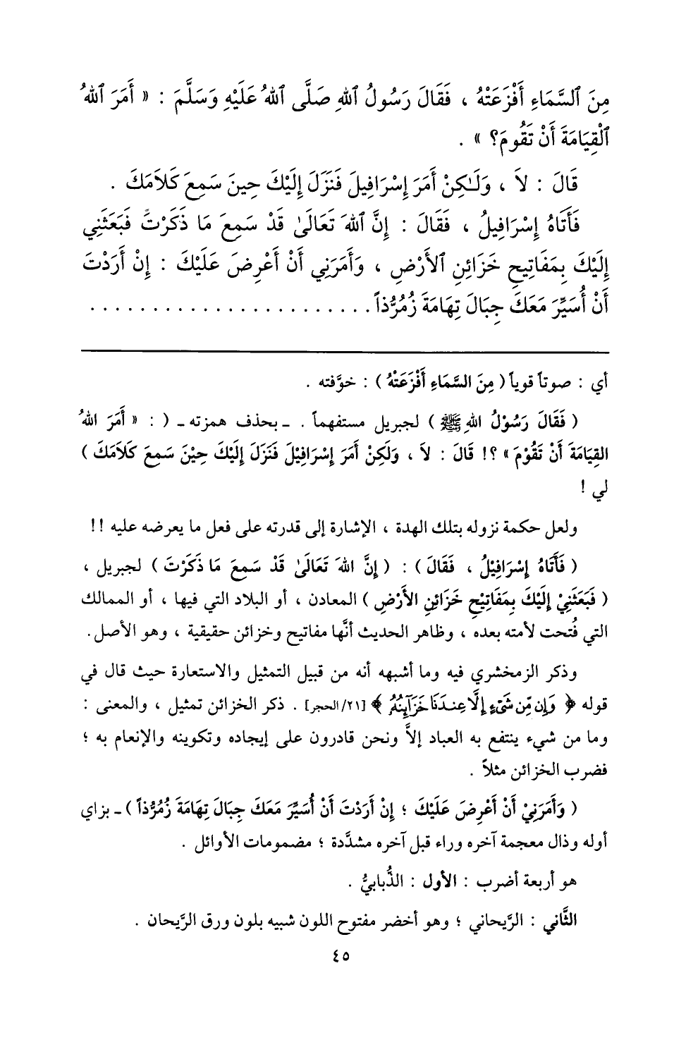 فأتاه إسرافيل، فقال: إنّ الله تعالى قد سمع ما ذكرت فبعثني إليك بمفاتيح خزائن الأرض، وأمرني أن أعرض عليك: إن أردت أن أسيّر معك جبال تهامة زمرّذا ...