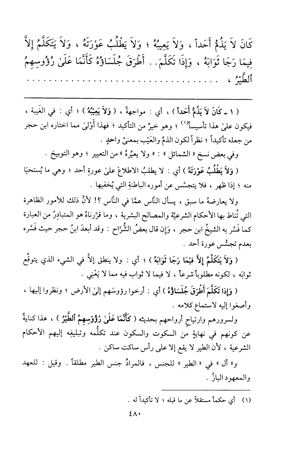 ولسرورهم وارتياح أرواحهم بحديثه (كأنّما على رؤوسهم الطّير) ، هذا كناية عن كونهم في نهاية من السكوت والسكون عند تكلّمه وتبليغه إليهم الأحكام الشرعية، لأن الطير لا يقع إلا على رأس ساكت ساكن.
