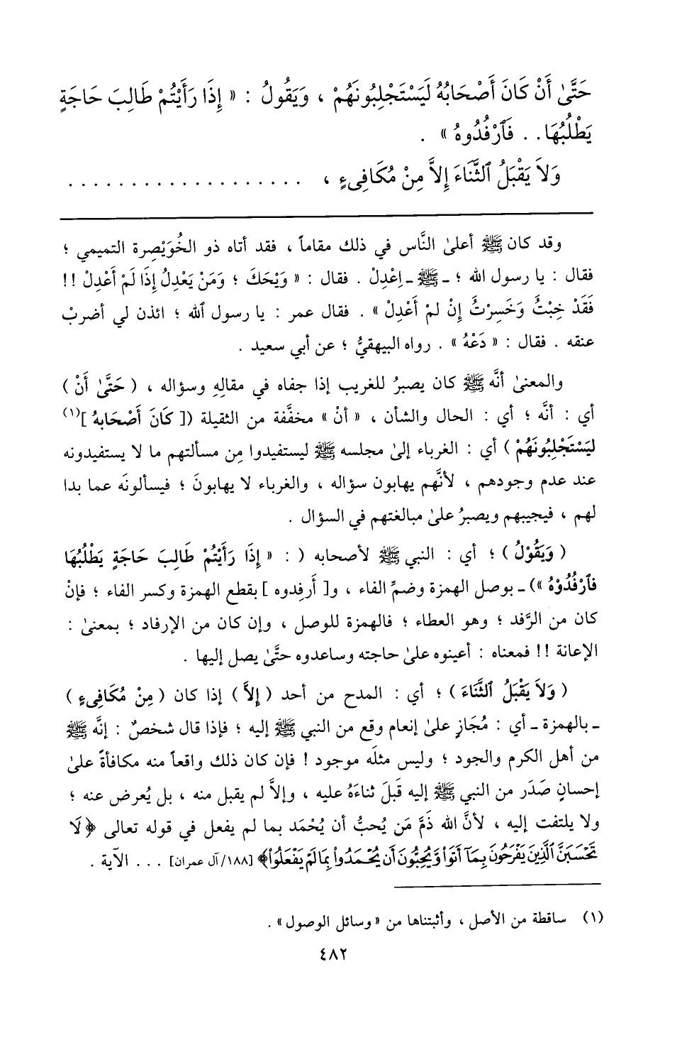 (ولا يقبل الثّناء) ؛ أي: المدح من أحد (إلّا) إذا كان (من مكافىء) - بالهمزة- أي: مجاز على إنعام وقع من النبي صلّى الله عليه وسلم إليه؛ فإذا قال شخص: إنّه صلّى الله عليه وسلم من أهل الكرم والجود؛ وليس مثله موجود! فإن كان ذلك واقعا منه مكافأة على إحسان صدر من النبي صلّى الله عليه وسلم إليه قبل ثناءه عليه، وإلّا لم يقبل منه، بل يعرض عنه؛ ولا يلتفت إليه، لأنّ الله ذمّ من يحبّ أن يحمد بما لم يفعل في قوله تعالى لا تَحْسَبَنَّ الَّذِينَ يَفْرَحُونَ بِما أَتَوْا وَيُحِبُّونَ أَنْ يُحْمَدُوا بِما لَمْ يَفْعَلُوا [188/ آل عمران] ... الآية.