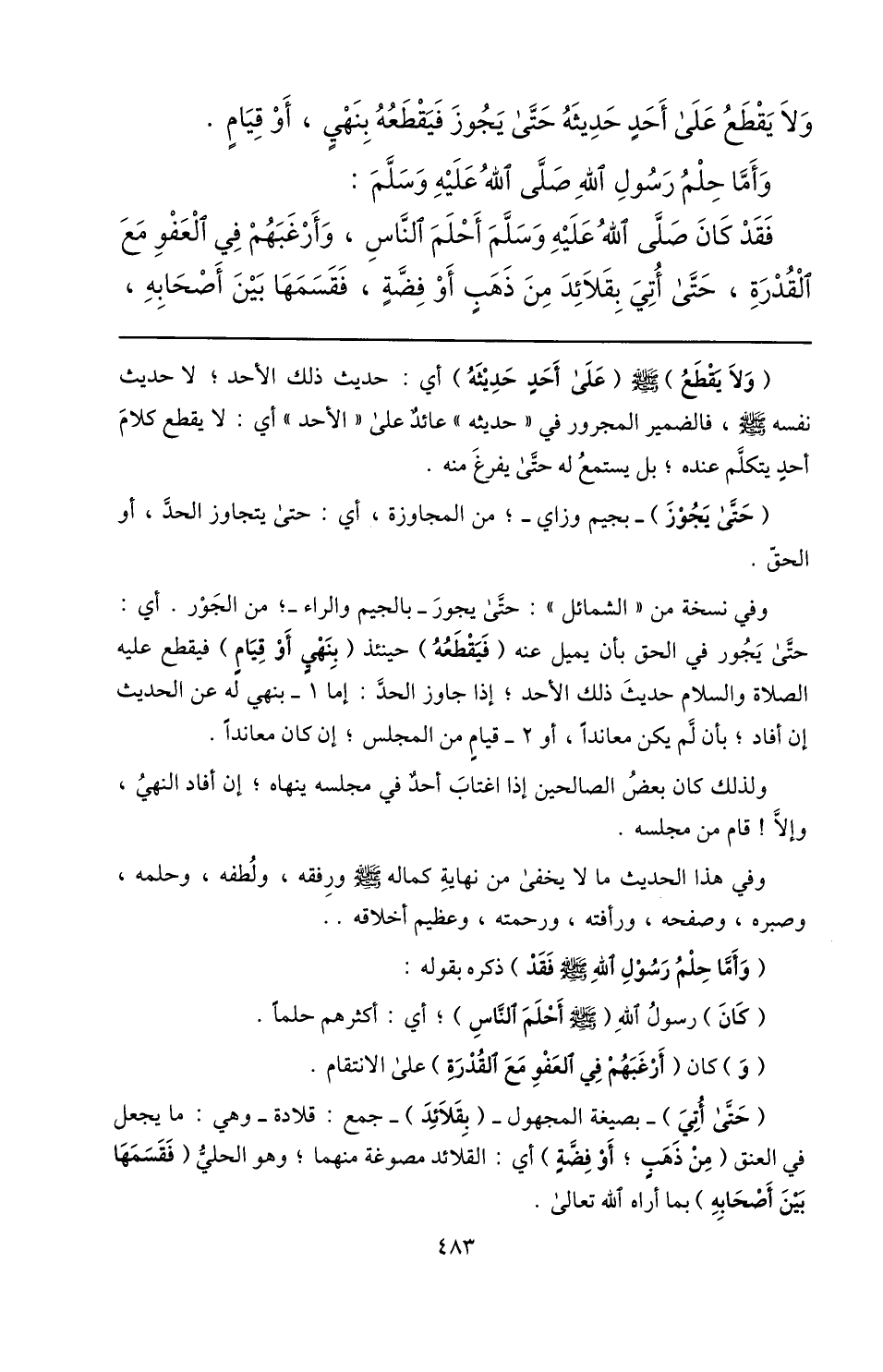 (ولا يقطع) صلى الله عليه وسلم (على أحد حديثه) أي: حديث ذلك الأحد؛ لا حديث نفسه صلّى الله عليه وسلم، فالضمير المجرور في «حديثه» عائد على «الأحد» أي: لا يقطع كلام أحد يتكلّم عنده؛ بل يستمع له حتّى يفرغ منه.