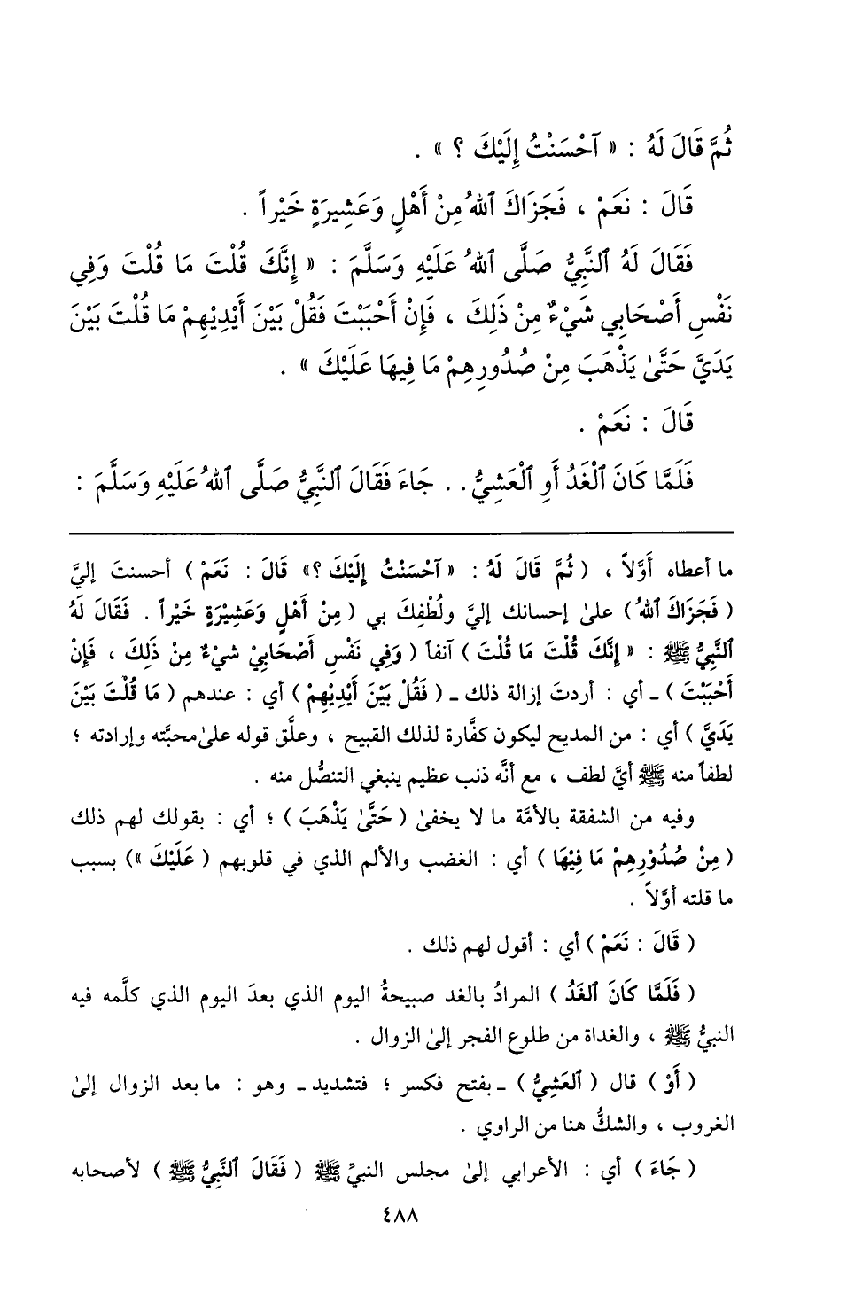 ما أعطاه أوّلا، (ثمّ قال له: «آحسنت إليك؟» قال: نعم) أحسنت إليّ (فجزاك الله) على إحسانك إليّ ولطفك بي (من أهل وعشيرة خيرا. فقال له النّبيّ صلّى الله عليه وسلم: «إنّك قلت ما قلت) آنفا (وفي نفس أصحابي شيء من ذلك، فإن أحببت) - أي: أردت إزالة ذلك- (فقل بين أيديهم) أي: عندهم (ما قلت بين يديّ) أي: من المديح ليكون كفّارة لذلك القبيح، وعلّق قوله على محبّته وإرادته؛ لطفا منه صلّى الله عليه وسلم أيّ لطف، مع أنّه ذنب عظيم ينبغي التنصّل منه.