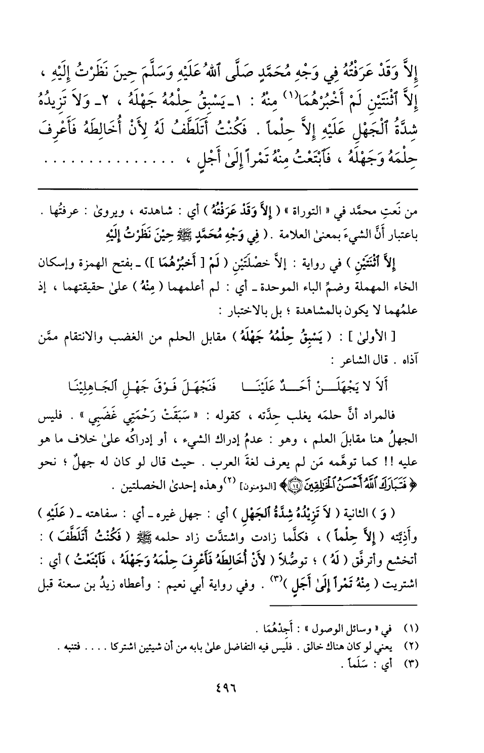 فالمراد أنّ حلمه يغلب حدّته، كقوله: «سبقت رحمتي غضبي» . فليس الجهل هنا مقابل العلم، وهو: عدم إدراك الشيء، أو إدراكه على خلاف ما هو عليه!! كما توهّمه من لم يعرف لغة العرب. حيث قال لو كان له جهل؛ نحو فَتَبارَكَ اللَّهُ أَحْسَنُ الْخالِقِينَ (14) [المؤمنون] «2» وهذه إحدى الخصلتين.