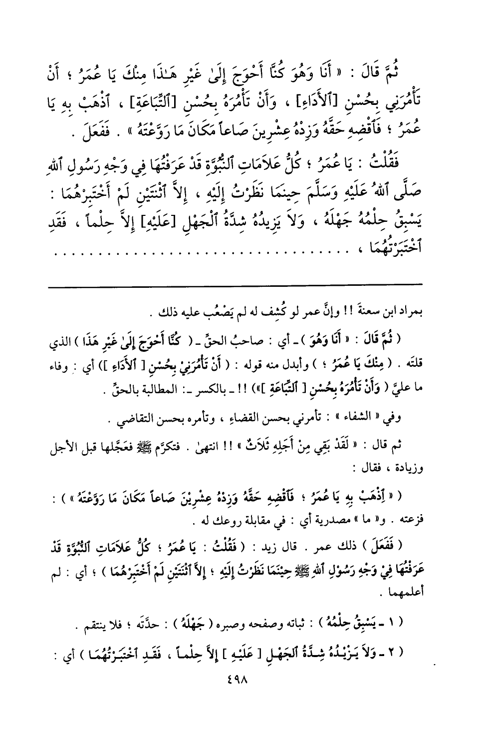 ثمّ قال: «أنا وهو كنّا أحوج إلى غير هذا منك يا عمر؛ أن تأمرني بحسن [الأداء] ، وأن تأمره بحسن [التّباعة] ، اذهب به يا عمر؛ فاقضه حقّه وزده عشرين صاعا مكان ما روّعته» . ففعل.