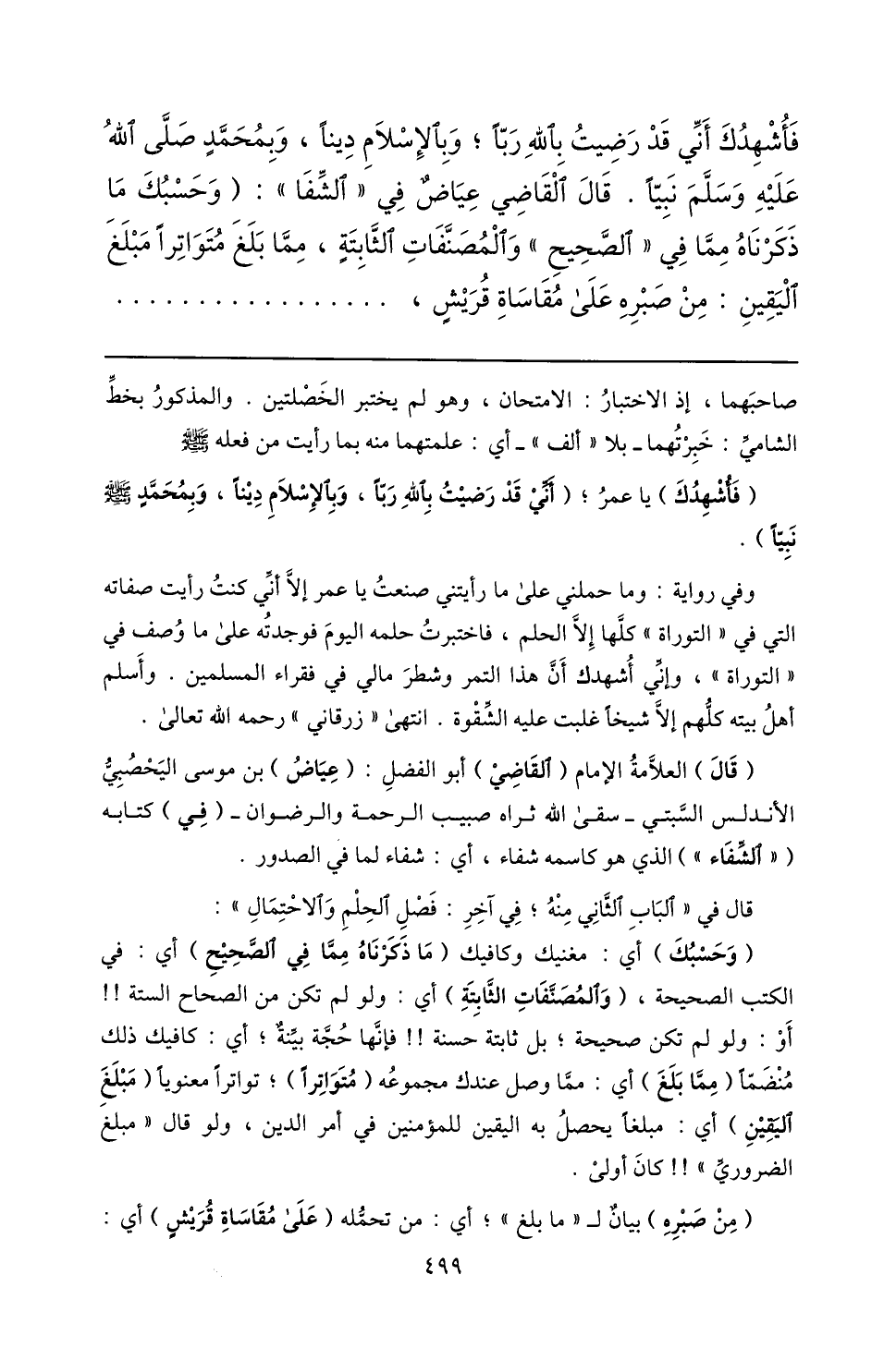 فأشهدك أنّي قد رضيت بالله ربّا؛ وبالإسلام دينا، وبمحمّد صلّى الله عليه وسلّم نبيّا. قال القاضي عياض في «الشّفا» : (وحسبك ما ذكرناه ممّا في «الصّحيح» والمصنّفات الثّابتة، ممّا بلغ متواترا مبلغ اليقين: من صبره على مقاساة قريش، ...