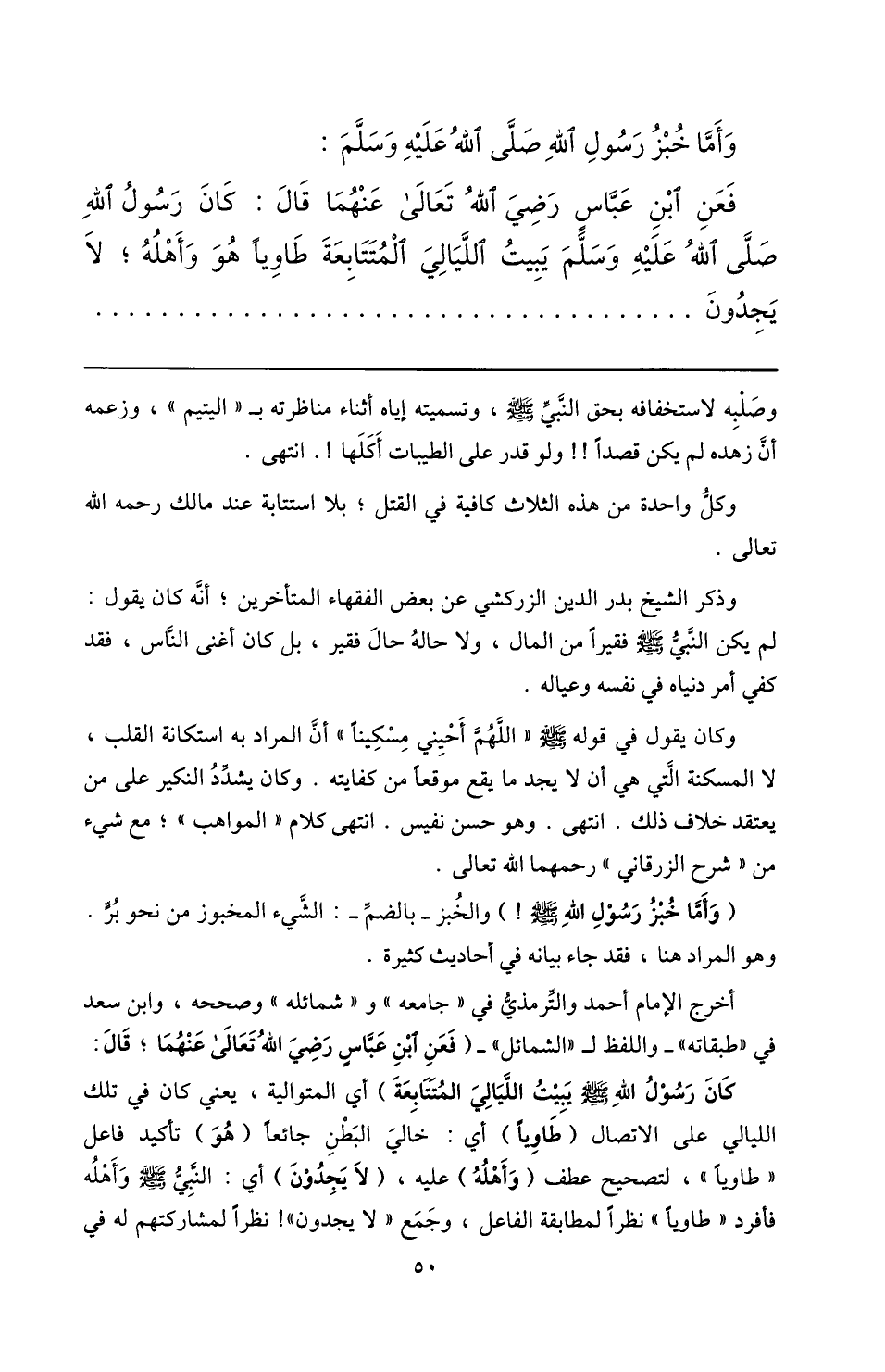 فعن ابن عبّاس رضي الله تعالى عنهما قال: كان رسول الله صلّى الله عليه وسلّم يبيت اللّيالي المتتابعة طاويا هو وأهله؛ لا يجدون ...