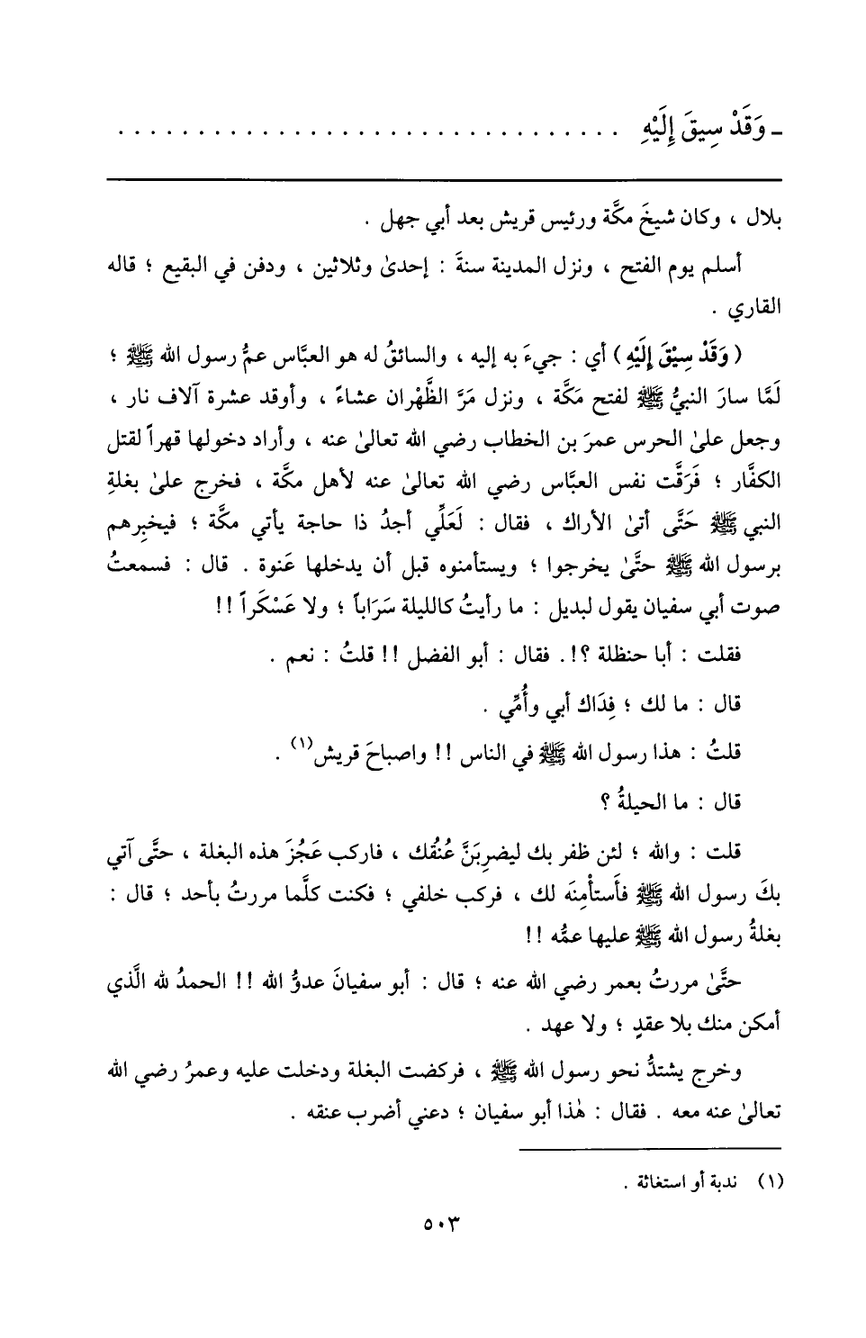 (وقد سيق إليه) أي: جيء به إليه، والسائق له هو العبّاس عمّ رسول الله صلّى الله عليه وسلم؛ لمّا سار النبيّ صلّى الله عليه وسلم لفتح مكّة، ونزل مرّ الظّهران عشاء، وأوقد عشرة آلاف نار، وجعل على الحرس عمر بن الخطاب رضي الله تعالى عنه، وأراد دخولها قهرا لقتل الكفّار؛ فرقّت نفس العبّاس رضي الله تعالى عنه لأهل مكّة، فخرج على بغلة النبي صلّى الله عليه وسلم حتّى أتى الأراك، فقال: لعلّي أجد ذا حاجة يأتي مكّة؛ فيخبرهم برسول الله صلّى الله عليه وسلم حتّى يخرجوا؛ ويستأمنوه قبل أن يدخلها عنوة. قال: فسمعت صوت أبي سفيان يقول لبديل: ما رأيت كالليلة سرابا؛ ولا عسكرا!!