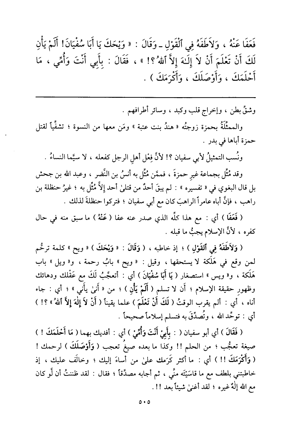 (ولاطفه في القول) ؛ إذ خاطبه، (وقال: «ويحك) «ويح» كلمة ترحّم لمن وقع في هلكة لا يستحقها، وقيل: «ويح» باب رحمة، و «ويل» باب هلكة، و «ويس» استصغار (يا أبا سفيان) أي: أتعجّب لك مع عقلك ودهائك وظهور حقيقة الإسلام؛ ألاتسلم (ألم يأن) ؛ من «أنى يأني» ؛ أي: جاء أناه، أي: ألم يقرب الوقت (لك أن تعلم) علما يقينا (ألاإله إلّا الله» ؟!) أي: توحّد الله، وتصدّق به فتسلم إسلاما صحيحا.