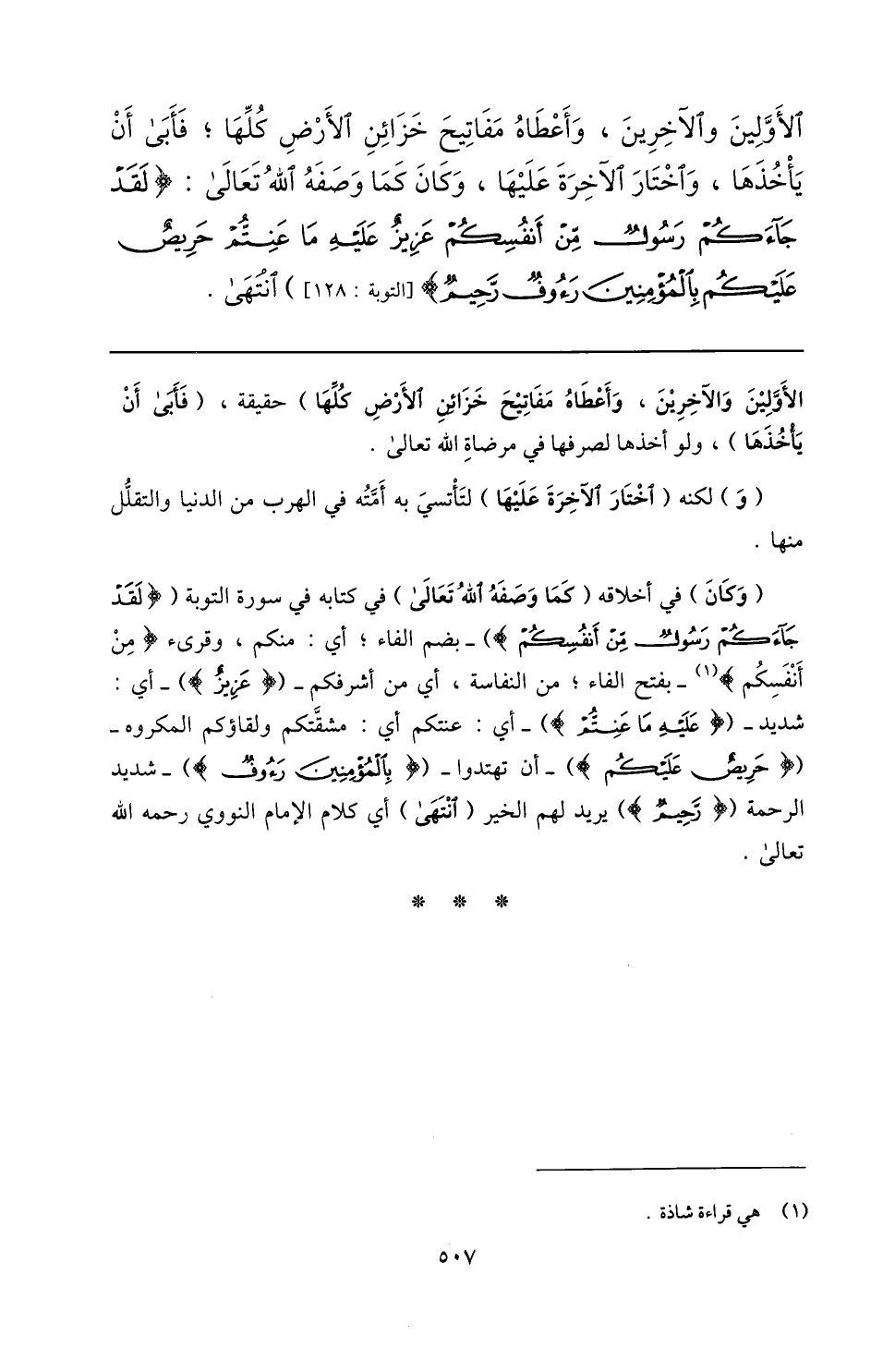 شديد- (عَلَيْهِ ما عَنِتُّمْ) - أي: عنتكم أي: مشقّتكم ولقاؤكم المكروه- (حَرِيصٌ عَلَيْكُمْ) - أن تهتدوا- (بِالْمُؤْمِنِينَ رَؤُفٌ) - شديد الرحمة (رَحِيمٌ) يريد لهم الخير (انتهى) أي كلام الإمام النووي رحمه الله تعالى.