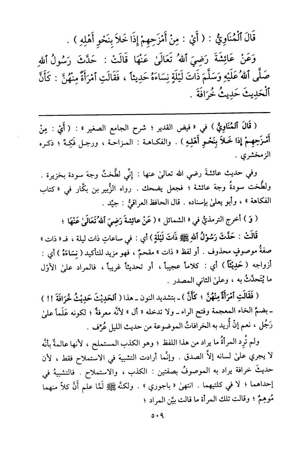 وعن عائشة رضي الله تعالى عنها قالت: حدّث رسول الله صلّى الله عليه وسلّم ذات ليلة نساءه حديثا، فقالت امرأة منهنّ: كأنّ الحديث حديث خرافة.