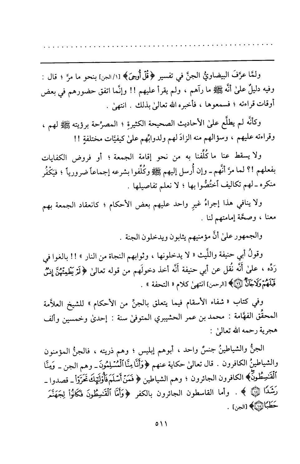 وفي كتاب «شفاء الأسقام فيما يتعلق بالجنّ من الأحكام» للشيخ العلّامة المحقّق الفهّامة: محمد بن عمر الحشيبري المتوفى سنة: إحدى وخمسين وألف هجرية رحمه الله تعالى: