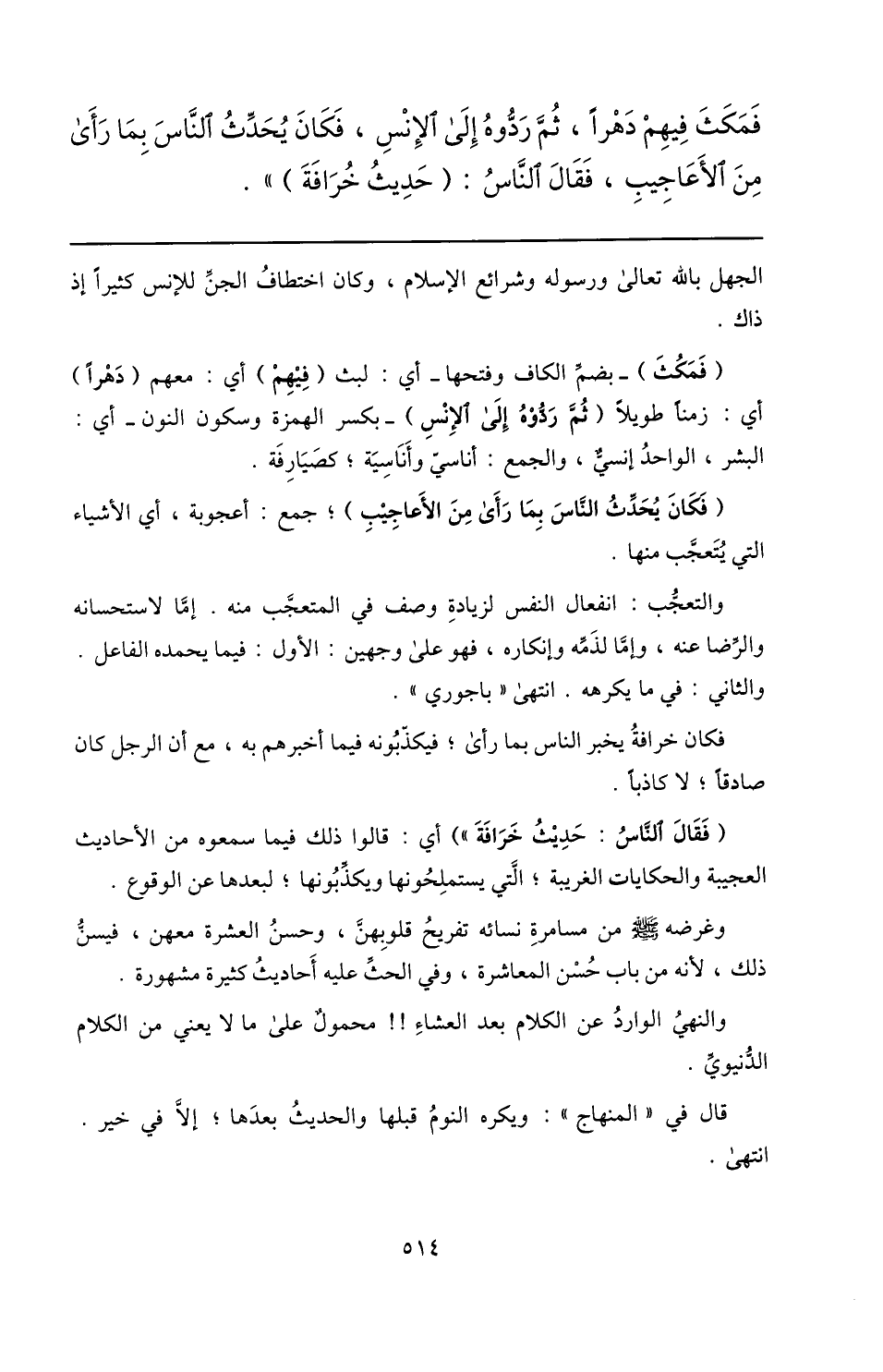 فمكث فيهم دهرا، ثمّ ردّوه إلى الإنس، فكان يحدّث النّاس بما رأى من الأعاجيب، فقال النّاس: (حديث خرافة) » .