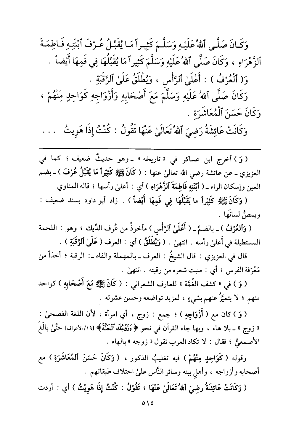 (و) أخرج ابن عساكر في «تاريخه» - وهو حديث ضعيف؛ كما في العزيزي- عن عائشة رضي الله تعالى عنها: (كان صلّى الله عليه وسلم كثيرا ما يقبّل عرف) - بضم العين وإسكان الراء- (ابنته فاطمة الزّهراء) أي: أعلى رأسها؛ قاله المناوي