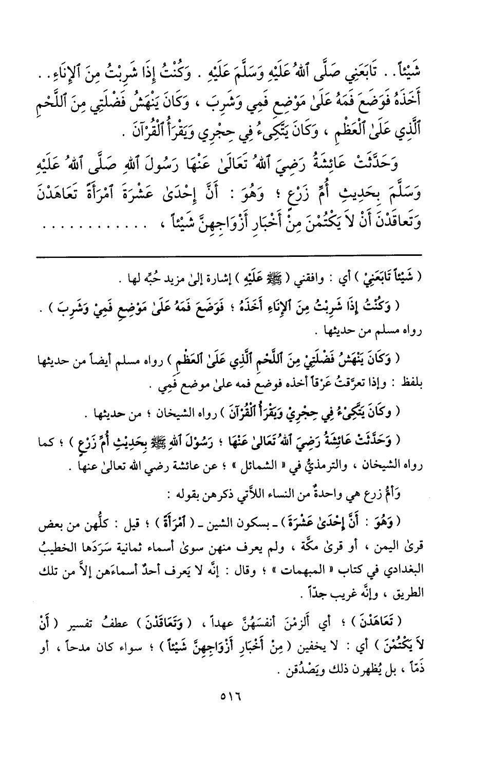 وحدّثت عائشة رضي الله تعالى عنها رسول الله صلّى الله عليه وسلّم بحديث أمّ زرع؛ وهو: أنّ إحدى عشرة امرأة تعاهدن وتعاقدن ألايكتمن من أخبار أزواجهنّ شيئا، ...