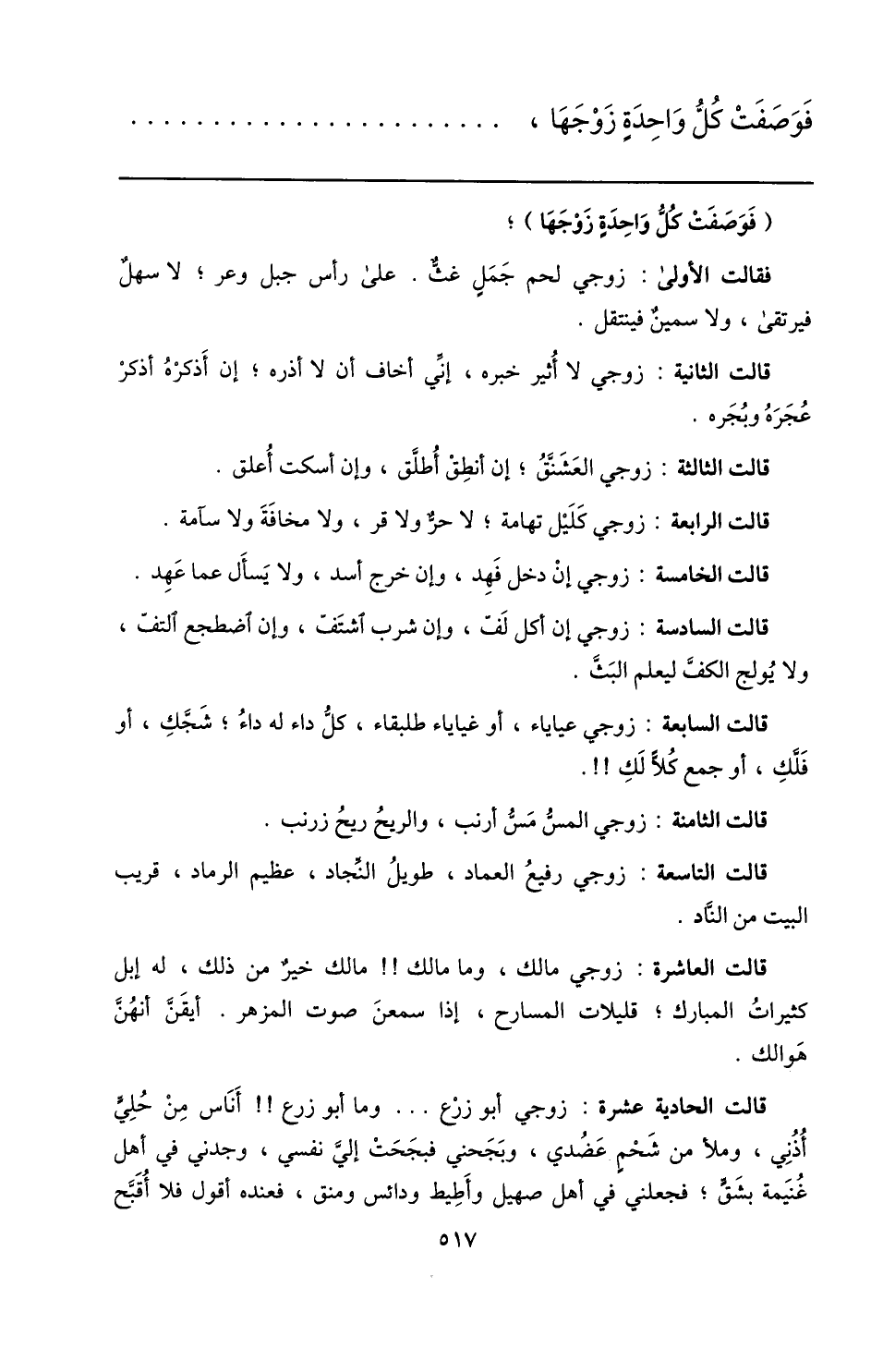 قالت الحادية عشرة: زوجي أبو زرع ... وما أبو زرع!! أناس من حليّ أذني، وملأ من شحم عضدي، وبجحني فبجحت إليّ نفسي، وجدني في أهل غنيمة بشقّ؛ فجعلني في أهل صهيل وأطيط ودائس ومنق، فعنده أقول فلا أقبّح