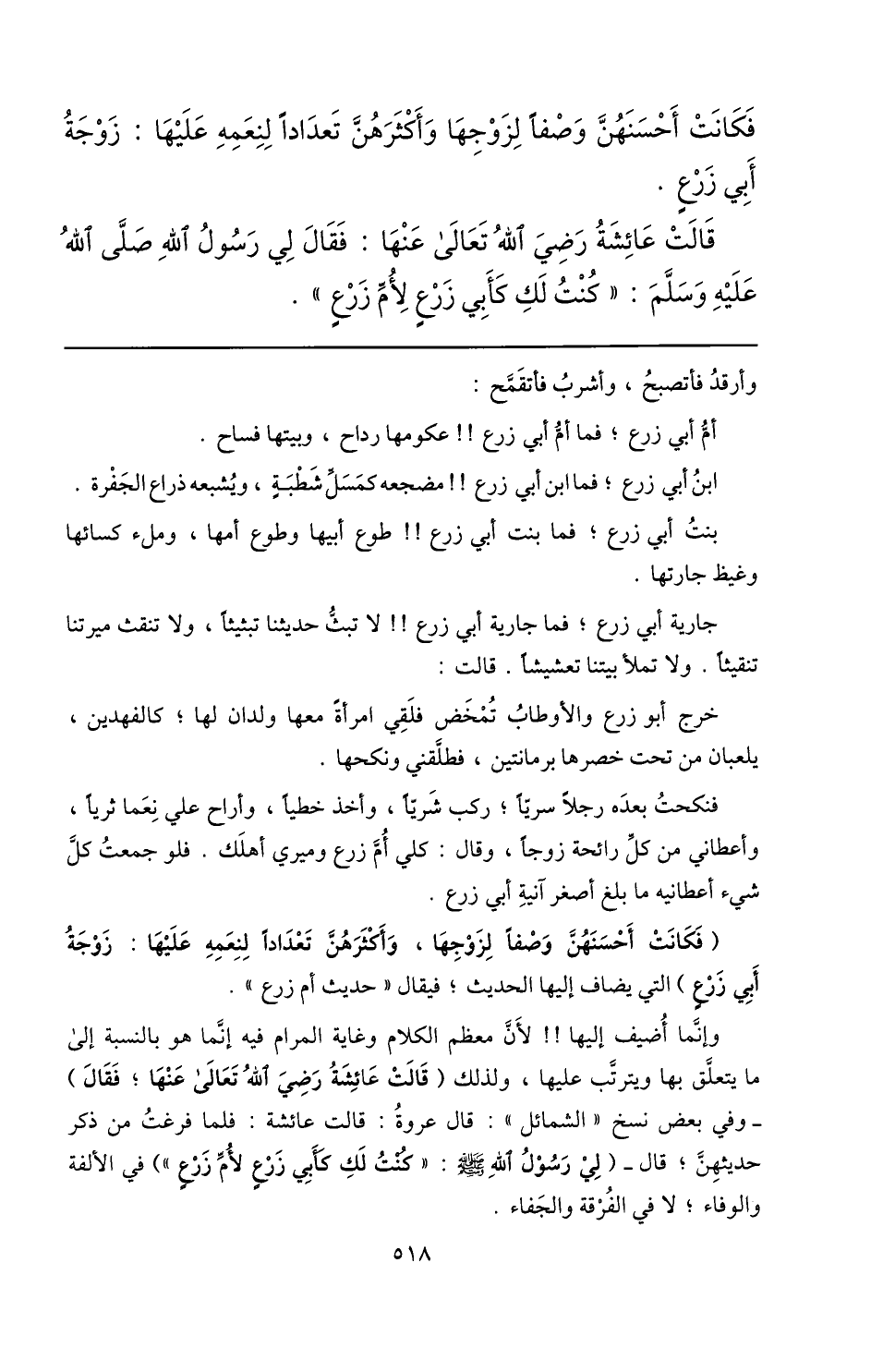 (فكانت أحسنهنّ وصفا لزوجها، وأكثرهنّ تعدادا لنعمه عليها: زوجة أبي زرع) التي يضاف إليها الحديث؛ فيقال «حديث أم زرع» .