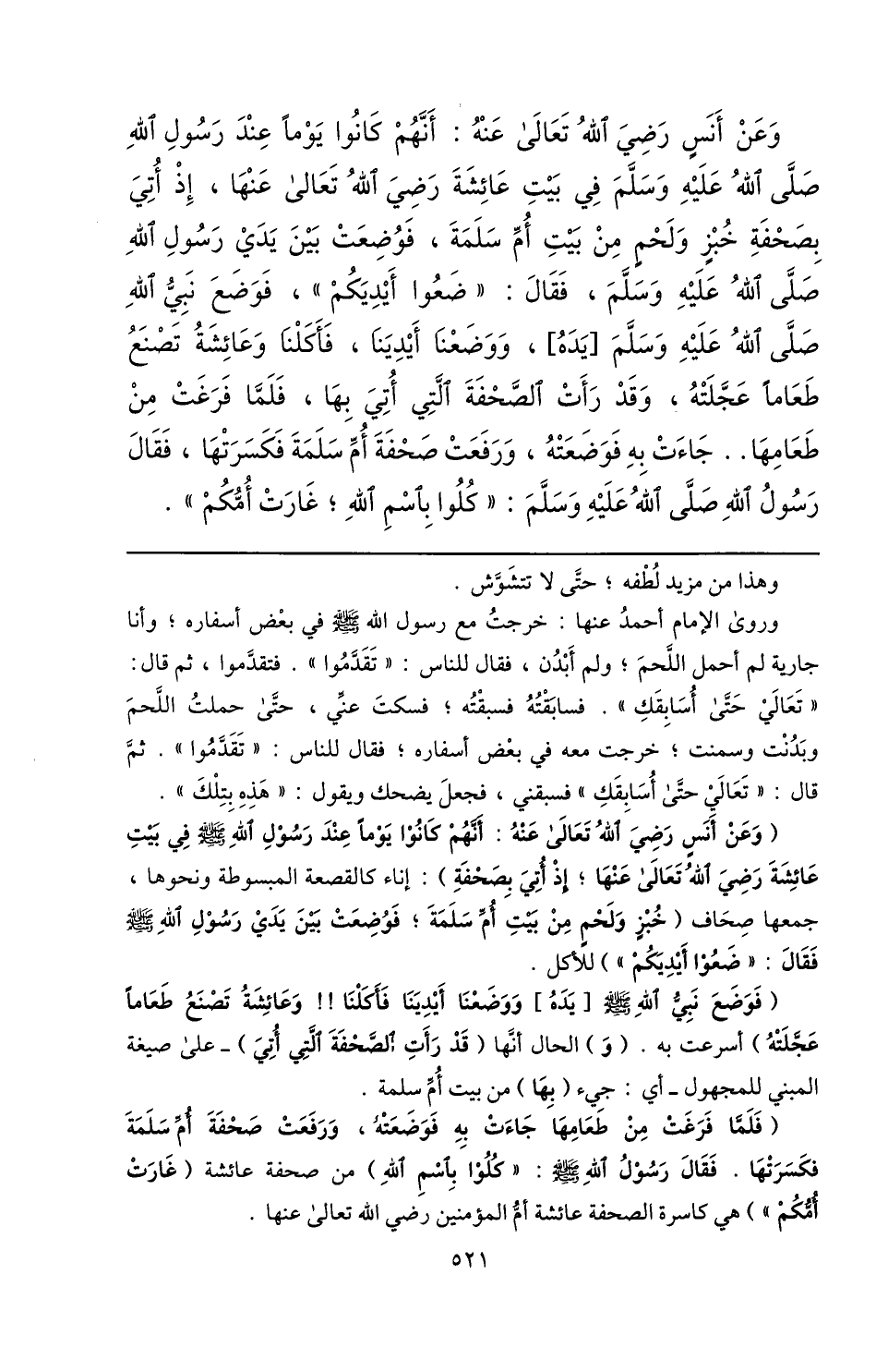 وعن أنس رضي الله تعالى عنه: أنّهم كانوا يوما عند رسول الله صلّى الله عليه وسلّم في بيت عائشة رضي الله تعالى عنها، إذ أتي بصحفة خبز ولحم من بيت أمّ سلمة، فوضعت بين يدي رسول الله صلّى الله عليه وسلّم، فقال: «ضعوا أيديكم» ، فوضع نبيّ الله صلّى الله عليه وسلّم [يده] ، ووضعنا أيدينا، فأكلنا وعائشة تصنع طعاما عجّلته، وقد رأت الصّحفة الّتي أتي بها، فلمّا فرغت من طعامها.. جاءت به فوضعته، ورفعت صحفة أمّ سلمة فكسرتها، فقال رسول الله صلّى الله عليه وسلّم: «كلوا باسم الله؛ غارت أمّكم» .