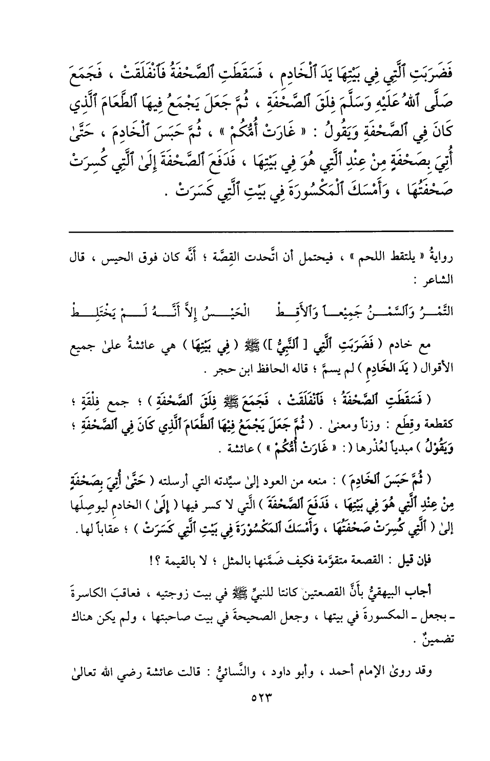 فضربت الّتي في بيتها يد الخادم، فسقطت الصّحفة فانفلقت، فجمع صلّى الله عليه وسلّم فلق الصّحفة، ثمّ جعل يجمع فيها الطّعام الّذي كان في الصّحفة ويقول: «غارت أمّكم» ، ثمّ حبس الخادم، حتّى أتي بصحفة من عند الّتي هو في بيتها، فدفع الصّحفة إلى الّتي كسرت صحفتها، وأمسك المكسورة في بيت الّتي كسرت.