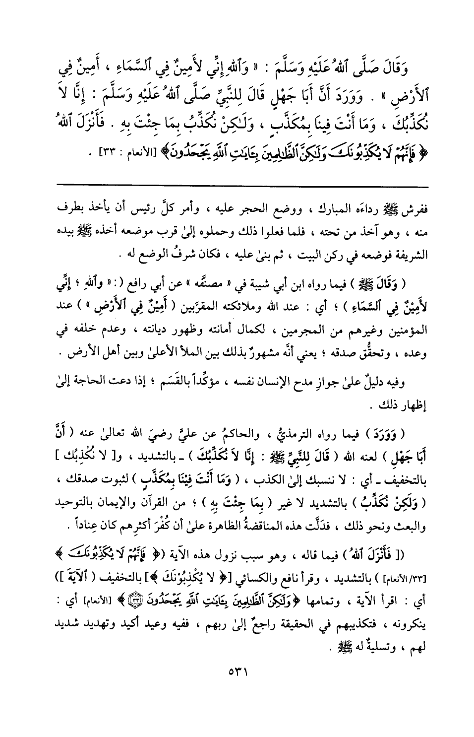 وقال صلّى الله عليه وسلّم: «والله إنّي لأمين في السّماء، أمين في الأرض» . وورد أنّ أبا جهل قال للنّبيّ صلّى الله عليه وسلّم: إنّا لا نكذّبك، وما أنت فينا بمكذّب، ولكن نكذّب بما جئت به. فأنزل الله فَإِنَّهُمْ لا يُكَذِّبُونَكَ وَلكِنَّ الظَّالِمِينَ بِآياتِ اللَّهِ يَجْحَدُونَ [الأنعام: 33] .