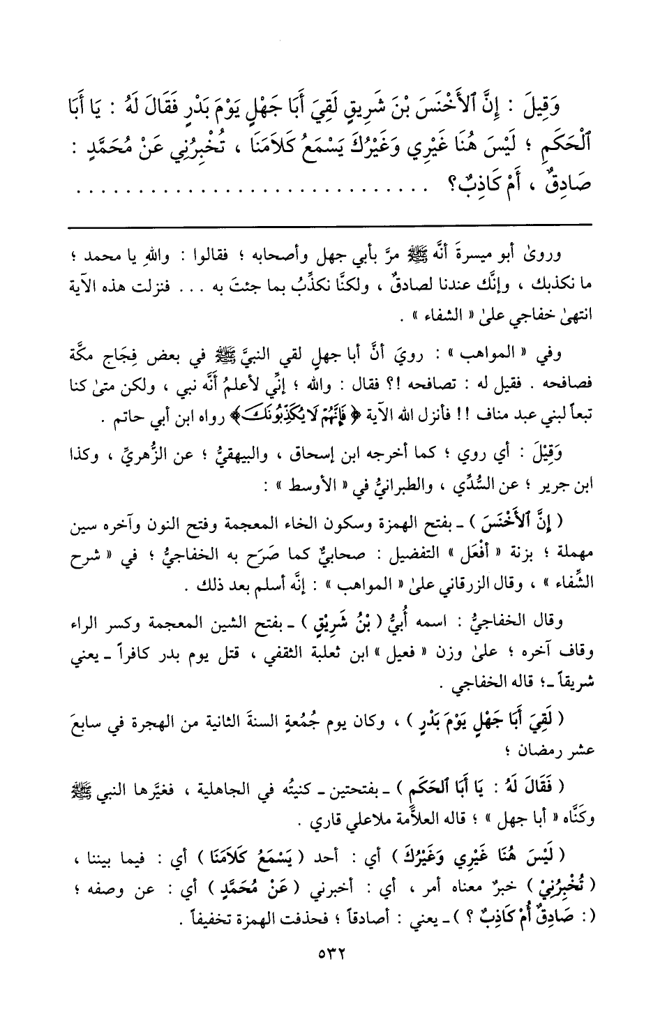 وروى أبو ميسرة أنّه صلّى الله عليه وسلم مرّ بأبي جهل وأصحابه؛ فقالوا: والله يا محمد؛ ما نكذبك، وإنّك عندنا لصادق، ولكنّا نكذّب بما جئت به ... فنزلت هذه الآية انتهى خفاجي على «الشفاء» .