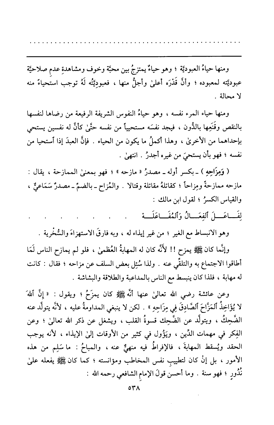 وعن عائشة رضي الله تعالى عنها أنّه صلّى الله عليه وسلم كان يمزح؛ ويقول: «إنّ الله لا يؤاخذ المزّاح الصّادق في مزاحه» . لكن لا ينبغي المداومة عليه، لأنّه يتولّد عنه الضّحك، ويتولّد عن الضّحك قسوة القلب، ويشغل عن ذكر الله تعالى؛ وعن الفكر في مهمات الدّين، ويؤول في كثير من الأوقات إلى الإيذاء، لأنه يوجب الحقد ويسقط المهابة، فالإفراط فيه منهيّ عنه، والمباح: ما سلم من هذه الأمور، بل إن كان لتطييب نفس المخاطب ومؤانسته؛ كما كان صلّى الله عليه وسلم يفعله على ندور؛ فهو سنة. وما أحسن قول الإمام الشافعي رحمه الله: