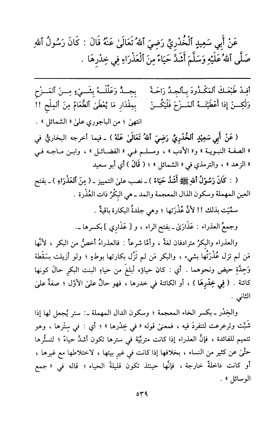 (: كان رسول الله صلّى الله عليه وسلم أشدّ حياء) - نصب على التمييز- (من العذراء) - بفتح العين المهملة وسكون الذال المعجمة والمد- هي البكر ذات العذرة.