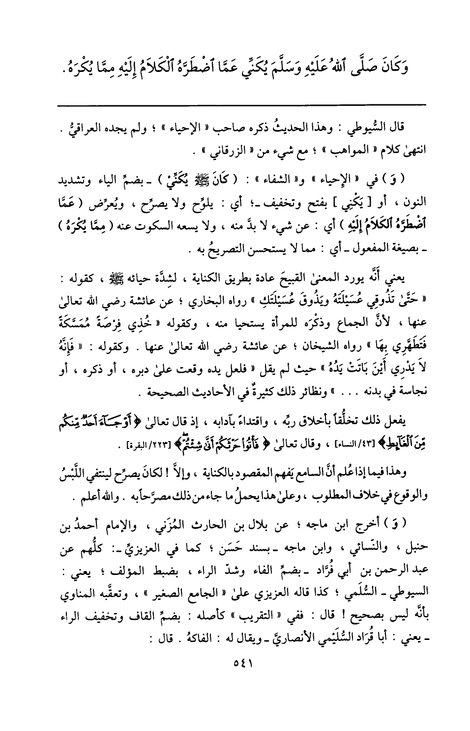(و) في «الإحياء» و «الشفاء» : (كان صلّى الله عليه وسلم يكنّي) - بضمّ الياء وتشديد النون، أو [يكني] بفتح وتخفيف-؛ أي: يلوّح ولا يصرّح، ويعرّض (عمّا اضطرّه الكلام إليه) أي: عن شيء لا بدّ منه، ولا يسعه السكوت عنه (ممّا يكره) - بصيغة المفعول- أي: مما لا يستحسن التصريح به.