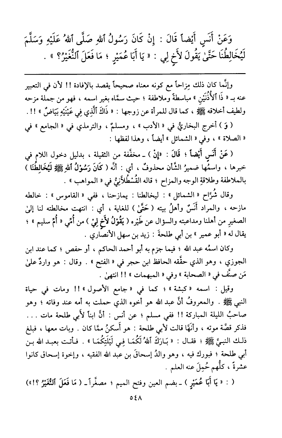 وعن أنس أيضا قال: إن كان رسول الله صلّى الله عليه وسلّم ليخالطنا حتّى يقول لأخ لي: «يا أبا عمير؛ ما فعل النّغير؟» .