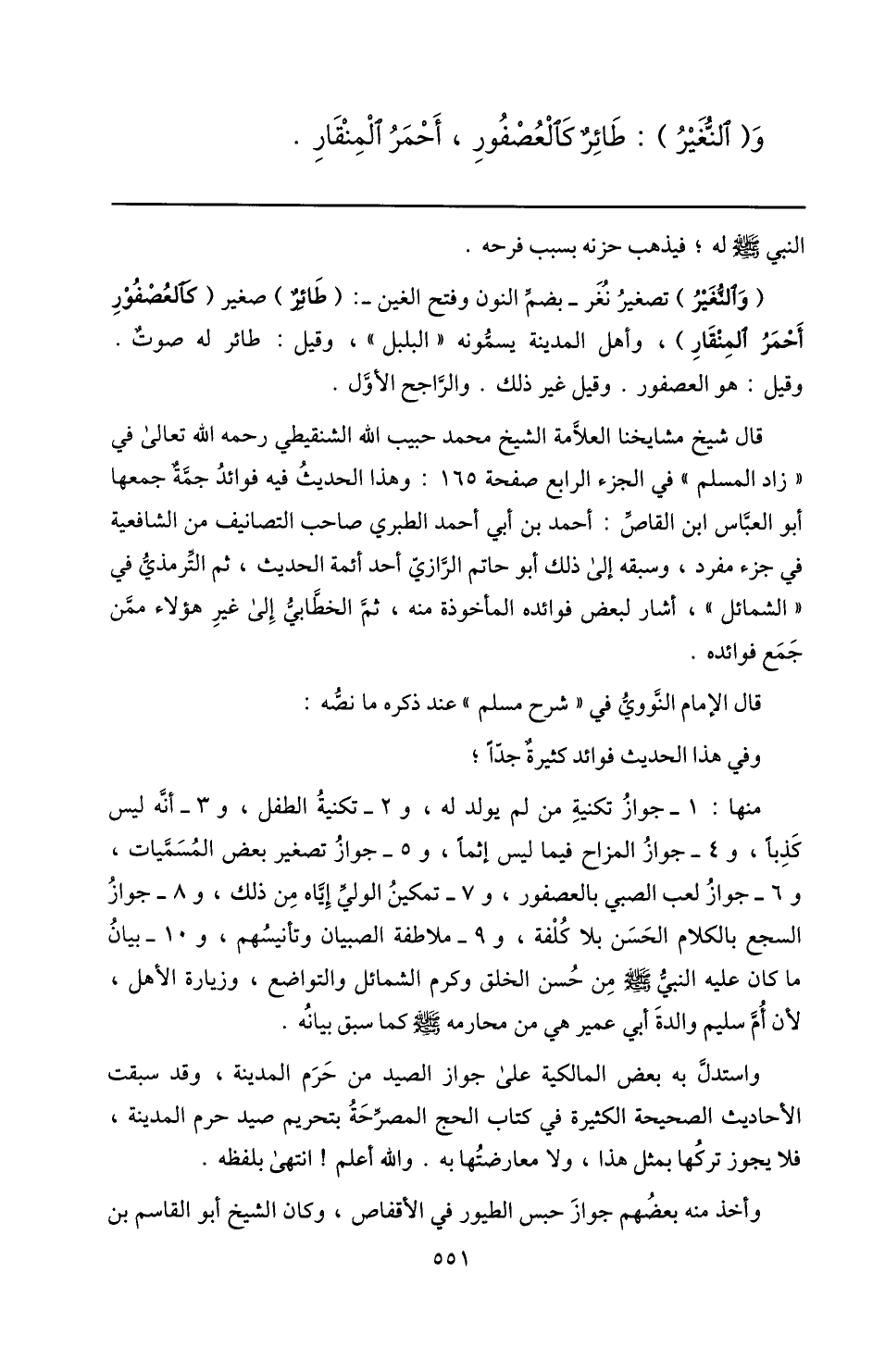 منها: 1- جواز تكنية من لم يولد له، و 2- تكنية الطفل، و 3- أنّه ليس كذبا، و 4- جواز المزاح فيما ليس إثما، و 5- جواز تصغير بعض المسمّيات، و 6- جواز لعب الصبي بالعصفور، و 7- تمكين الوليّ إيّاه من ذلك، و 8- جواز السجع بالكلام الحسن بلا كلفة، و 9- ملاطفة الصبيان وتأنيسهم، و 10- بيان ما كان عليه النبيّ صلّى الله عليه وسلم من حسن الخلق وكرم الشمائل والتواضع، وزيارة الأهل، لأن أمّ سليم والدة أبي عمير هي من محارمه صلّى الله عليه وسلم كما سبق بيانه.