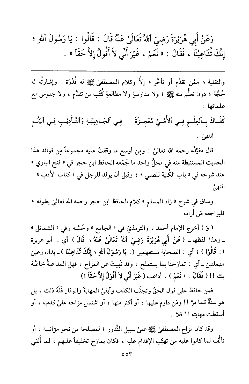 وعن أبي هريرة رضي الله تعالى عنه قال: قالوا: يا رسول الله؛ إنّك تداعبنا، فقال: «نعم، غير أنّي لا أقول إلّا حقّا» .