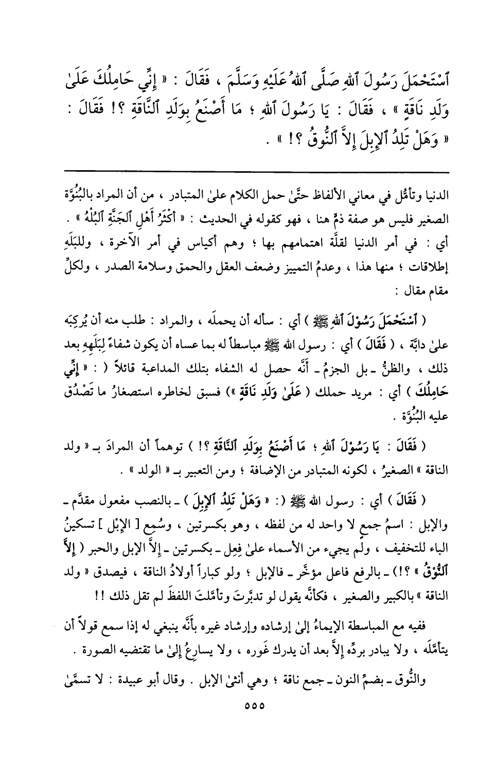استحمل رسول الله صلّى الله عليه وسلّم، فقال: «إنّي حاملك على ولد ناقة» ، فقال: يا رسول الله؛ ما أصنع بولد النّاقة؟! فقال: