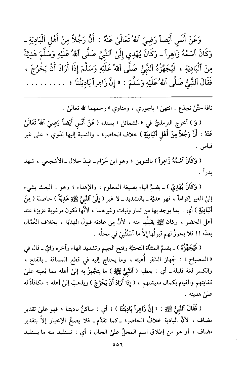 وعن أنس أيضا رضي الله تعالى عنه: أنّ رجلا من أهل البادية- وكان اسمه زاهرا- وكان يهدي إلى النّبيّ صلّى الله عليه وسلّم هديّة من البادية، فيجهّزه النّبيّ صلّى الله عليه وسلّم إذا أراد أن يخرج، فقال النّبيّ صلّى الله عليه وسلّم: «إنّ زاهرا باديتنا؛ ...