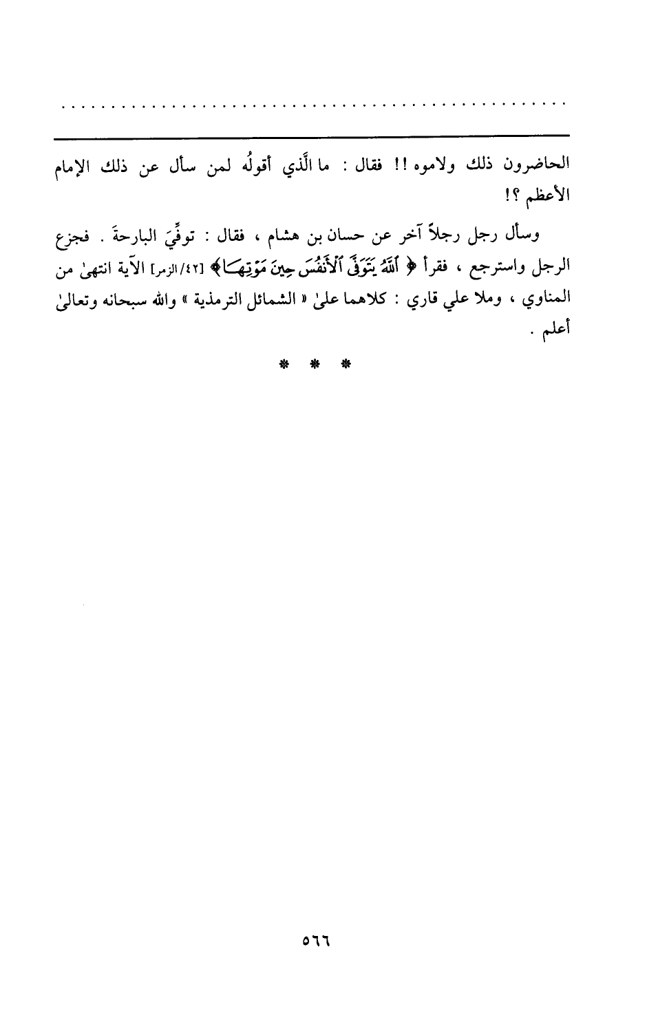 وسأل رجل رجلا آخر عن حسان بن هشام، فقال: توفّي البارحة. فجزع الرجل واسترجع، فقرأ اللَّهُ يَتَوَفَّى الْأَنْفُسَ حِينَ مَوْتِها [42/ الزمر] الآية انتهى من المناوي، وملا علي قاري: كلاهما على «الشمائل الترمذية» والله سبحانه وتعالى أعلم.