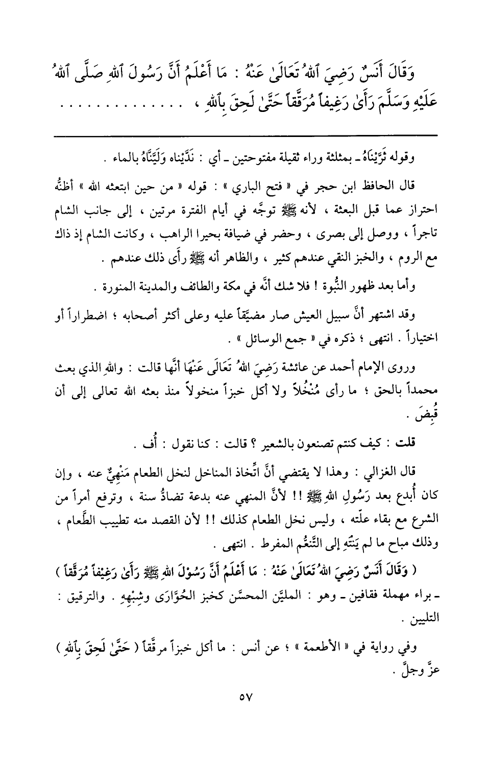 وقال أنس رضي الله تعالى عنه: ما أعلم أنّ رسول الله صلّى الله عليه وسلّم رأى رغيفا مرقّقا حتّى لحق بالله، ...