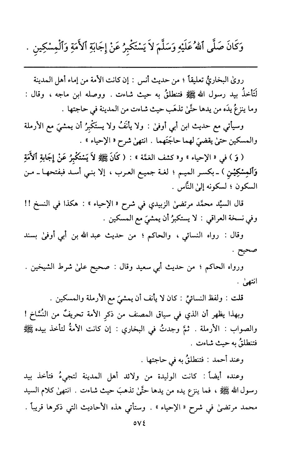 وعنده أيضا: كانت الوليدة من ولائد أهل المدينة لتجيء فتأخذ بيد رسول الله صلّى الله عليه وسلم، فما ينزع يده من يدها حتّى تذهب حيث شاءت. انتهى كلام السيد محمد مرتضى في شرح «الإحياء» . وستأتي هذه الأحاديث التي ذكرها قريبا.