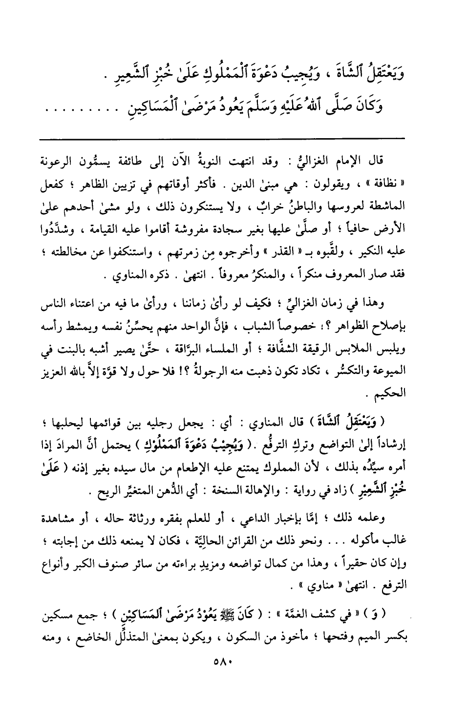 قال الإمام الغزاليّ: وقد انتهت النوبة الآن إلى طائفة يسمّون الرعونة «نظافة» ، ويقولون: هي مبنى الدين. فأكثر أوقاتهم في تزيين الظاهر؛ كفعل الماشطة لعروسها والباطن خراب، ولا يستنكرون ذلك، ولو مشى أحدهم على الأرض حافيا؛ أو صلّى عليها بغير سجادة مفروشة أقاموا عليه القيامة، وشدّدوا عليه النكير، ولقّبوه ب «القذر» وأخرجوه من زمرتهم، واستنكفوا عن مخالطته؛ فقد صار المعروف منكرا، والمنكر معروفا. انتهى. ذكره المناوي.