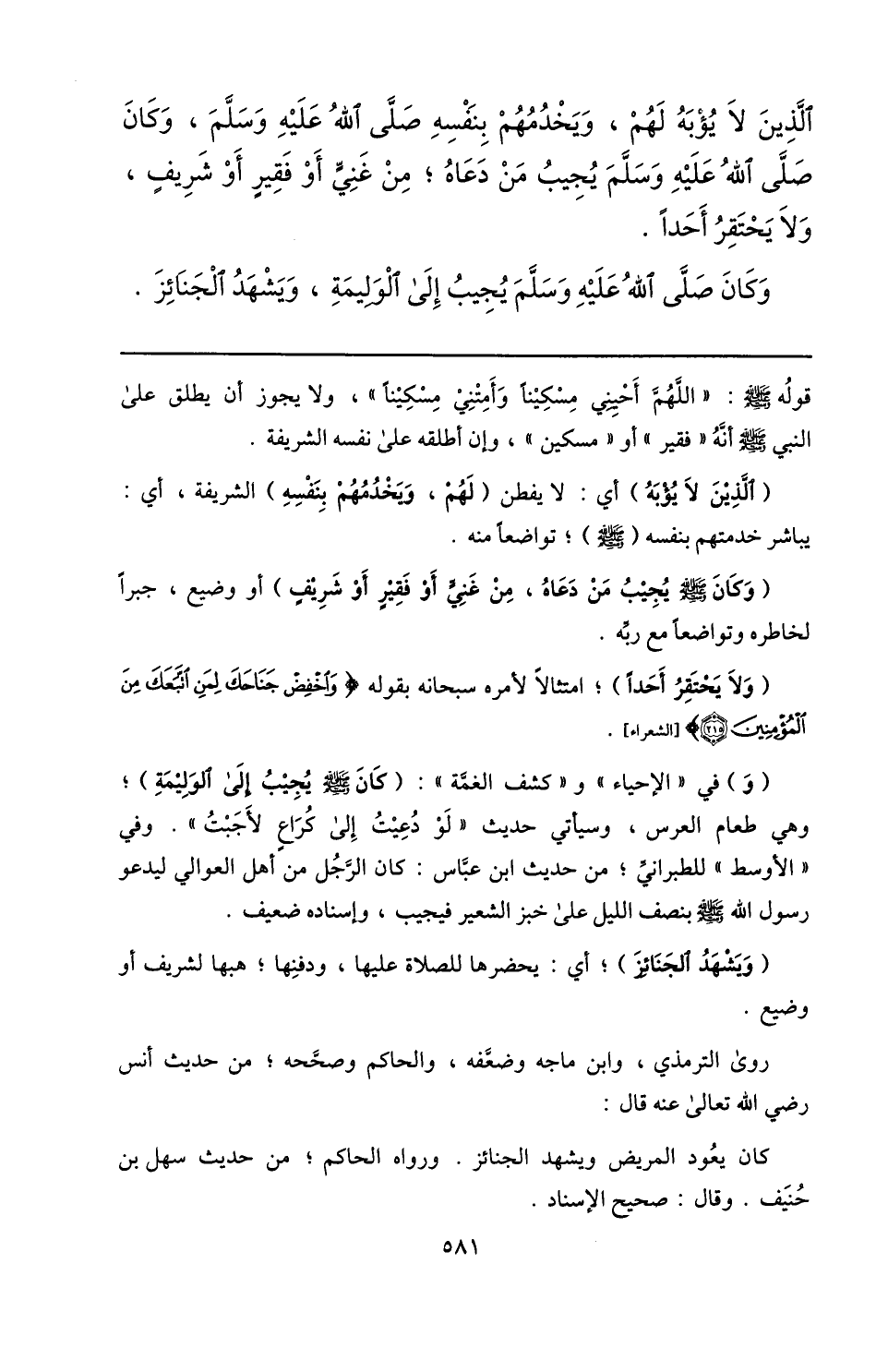 وكان صلّى الله عليه وسلّم يجيب إلى الوليمة، ويشهد الجنائز.