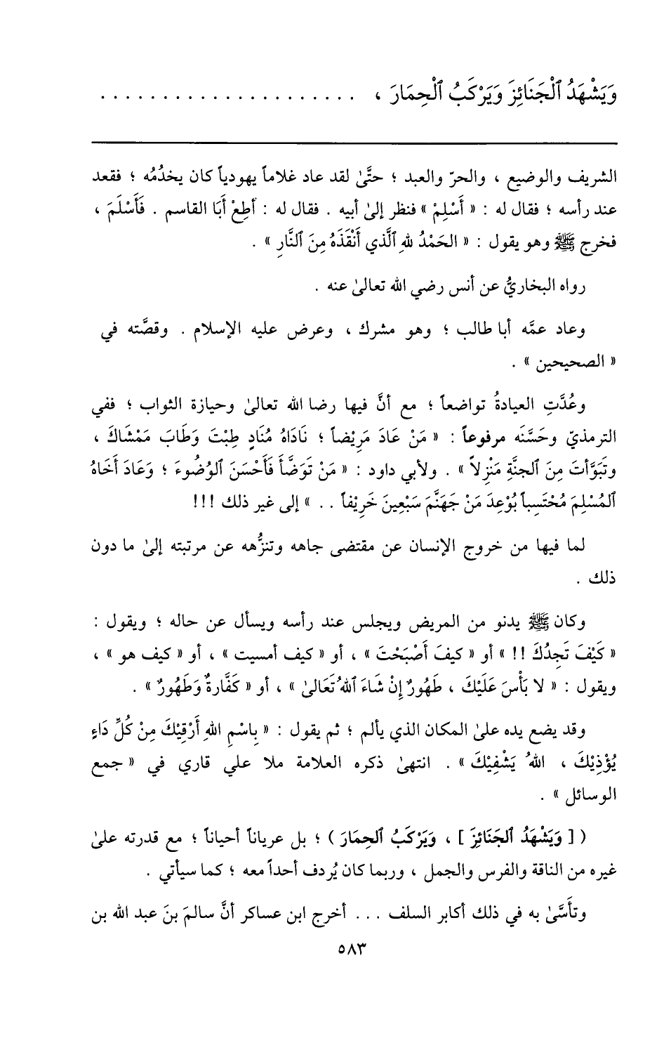 الشريف والوضيع، والحرّ والعبد؛ حتّى لقد عاد غلاما يهوديا كان يخدمه؛ فقعد عند رأسه؛ فقال له: «أسلم» فنظر إلى أبيه. فقال له: أطع أبا القاسم. فأسلم، فخرج صلّى الله عليه وسلم وهو يقول: «الحمد لله الّذي أنقذه من النّار» .