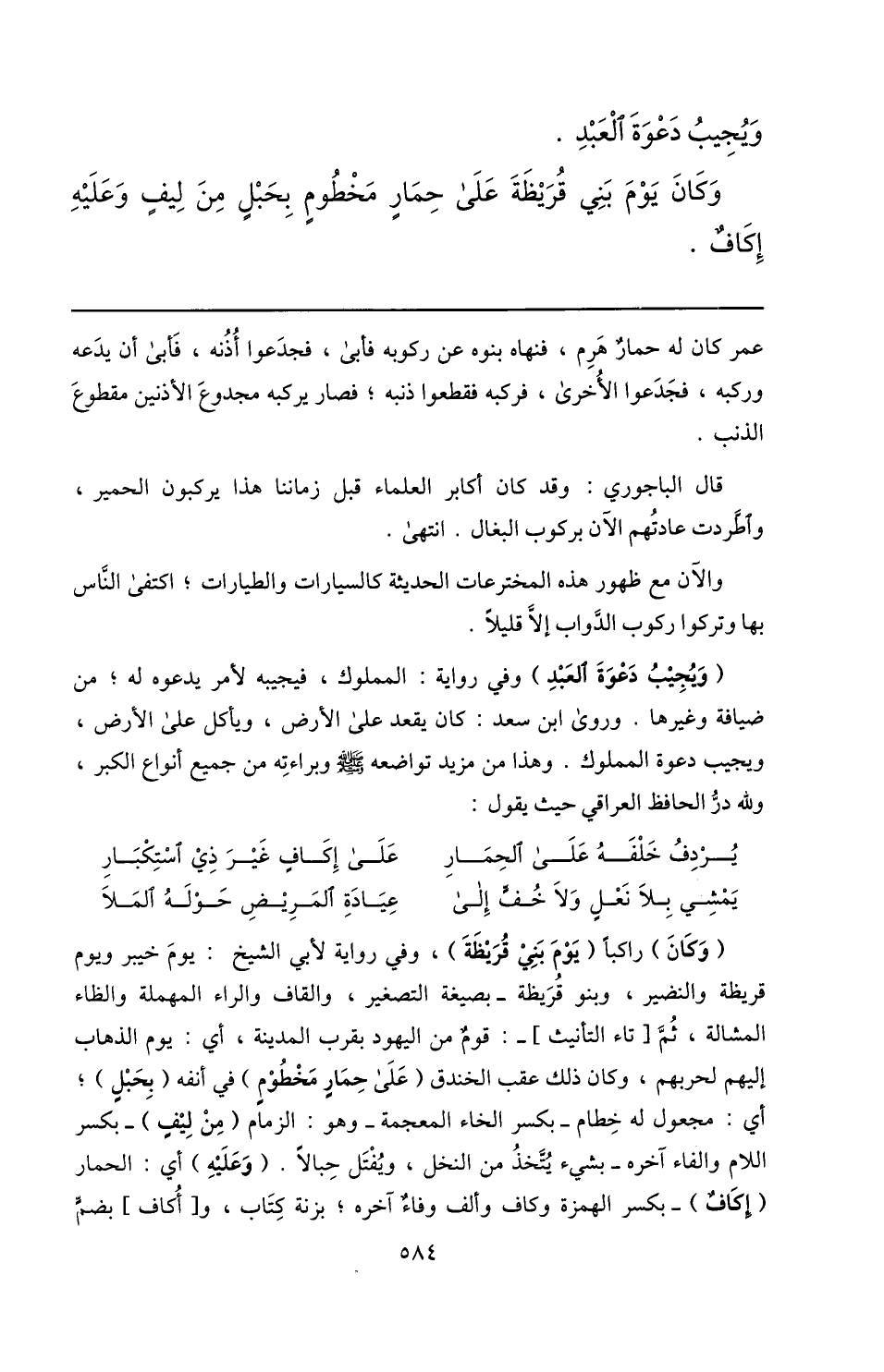 وكان يوم بني قريظة على حمار مخطوم بحبل من ليف وعليه إكاف.