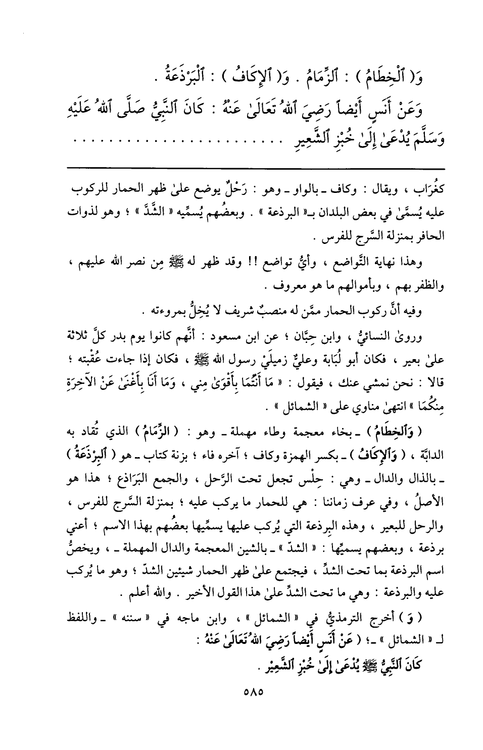 (والخطام) - بخاء معجمة وطاء مهملة- وهو: (الزّمام) الذي تقاد به الدابّة، (والإكاف) - بكسر الهمزة وكاف؛ آخره فاء؛ بزنة كتاب- هو (البرذعة) - بالذال والدال- وهي: حلس تجعل تحت الرّحل، والجمع البراذع؛ هذا هو الأصل، وفي عرف زماننا: هي للحمار ما يركب عليه؛ بمنزلة السّرج للفرس، والرحل للبعير، وهذه البرذعة التي يركب عليها يسمّيها بعضهم بهذا الاسم؛ أعني برذعة، وبعضهم يسميّها: «الشدّ» - بالشين المعجمة والدال المهملة-، ويخصّ اسم البرذعة بما تحت الشدّ، فيجتمع على ظهر الحمار شيئين الشدّ؛ وهو ما يركب عليه والبرذعة: وهي ما تحت الشدّ على هذا القول الأخير. والله أعلم.