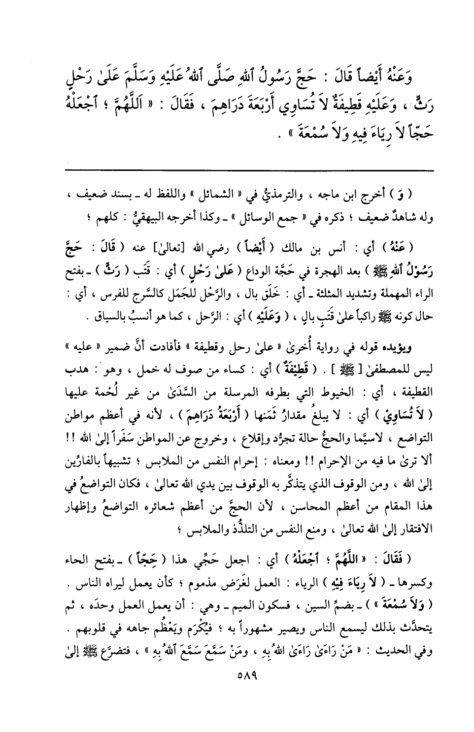 وعنه أيضا قال: حجّ رسول الله صلّى الله عليه وسلّم على رحل رثّ، وعليه قطيفة لا تساوي أربعة دراهم، فقال: «اللهمّ؛ اجعله حجّا لا رياء فيه ولا سمعة» .