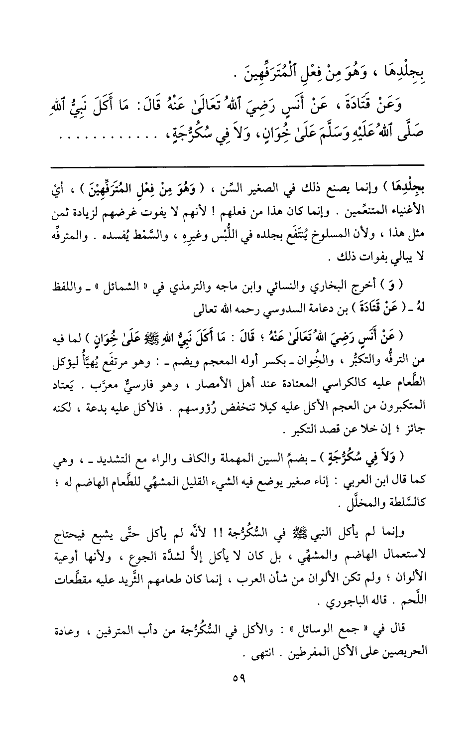 وإنما لم يأكل النبي صلّى الله عليه وسلم في السّكرّجة!! لأنّه لم يأكل حتّى يشبع فيحتاج لاستعمال الهاضم والمشهّي، بل كان لا يأكل إلّا لشدّة الجوع، ولأنها أوعية الألوان؛ ولم تكن الألوان من شأن العرب، إنما كان طعامهم الثّريد عليه مقطّعات اللّحم. قاله الباجوري.