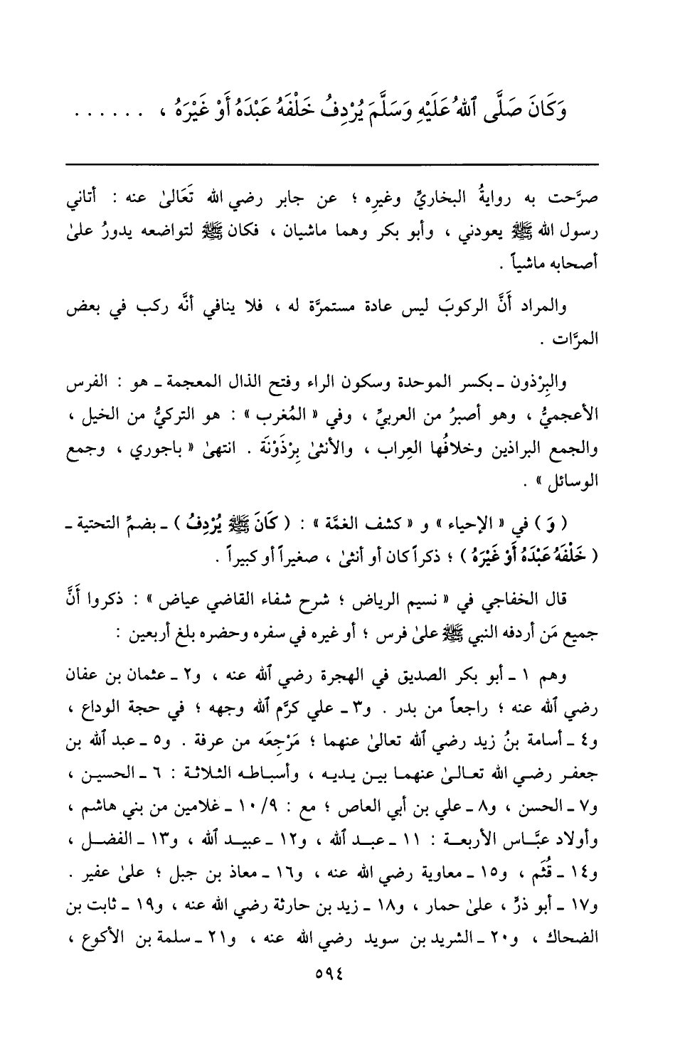 قال الخفاجي في «نسيم الرياض؛ شرح شفاء القاضي عياض» : ذكروا أنّ جميع من أردفه النبي صلّى الله عليه وسلم على فرس؛ أو غيره في سفره وحضره بلغ أربعين: