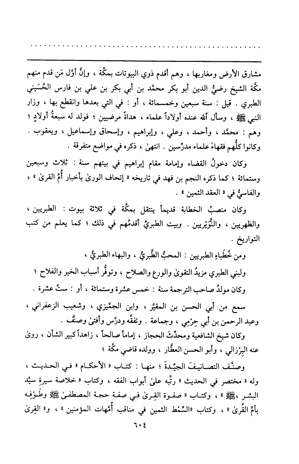 مشارق الأرض ومغاربها، وهم أقدم ذوي البيوتات بمكّة، وإنّ أوّل من قدم منهم مكّة الشيخ رضيّ الدين أبو بكر محمّد بن أبي بكر بن علي بن فارس الحسيني الطبري. قيل: سنة سبعين وخمسمائة، أو: في التي بعدها وانقطع بها، وزار النبي صلّى الله عليه وسلم، وسأل الله عنده أولادا علماء، هداة مرضيين؛ فولد له سبعة أولاد؛ وهم: محمّد، وأحمد، وعلي، وإبراهيم، وإسحاق وإسماعيل، ويعقوب.