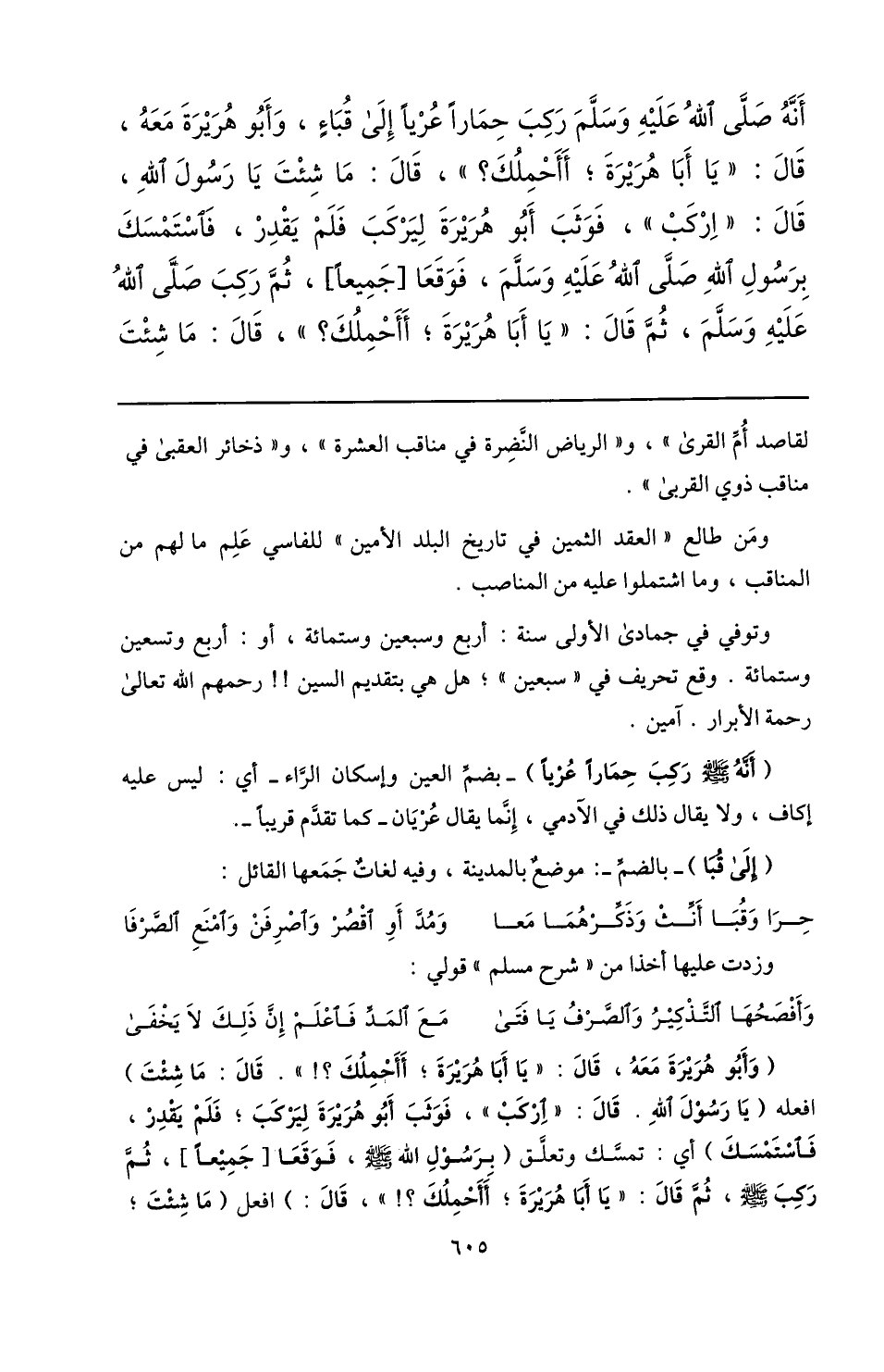 أنّه صلّى الله عليه وسلّم ركب حمارا عريا إلى قباء، وأبو هريرة معه، قال: «يا أبا هريرة؛ أأحملك؟» ، قال: ما شئت يا رسول الله، قال: «اركب» ، فوثب أبو هريرة ليركب فلم يقدر، فاستمسك برسول الله صلّى الله عليه وسلّم، فوقعا [جميعا] ، ثمّ ركب صلّى الله عليه وسلّم، ثمّ قال: «يا أبا هريرة؛ أأحملك؟» ، قال: ما شئت