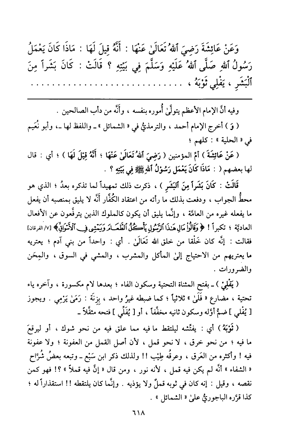 وعن عائشة رضي الله تعالى عنها: أنّه قيل لها: ماذا كان يعمل رسول الله صلّى الله عليه وسلّم في بيته؟ قالت: كان بشرا من البشر، يفلي ثوبه، ...