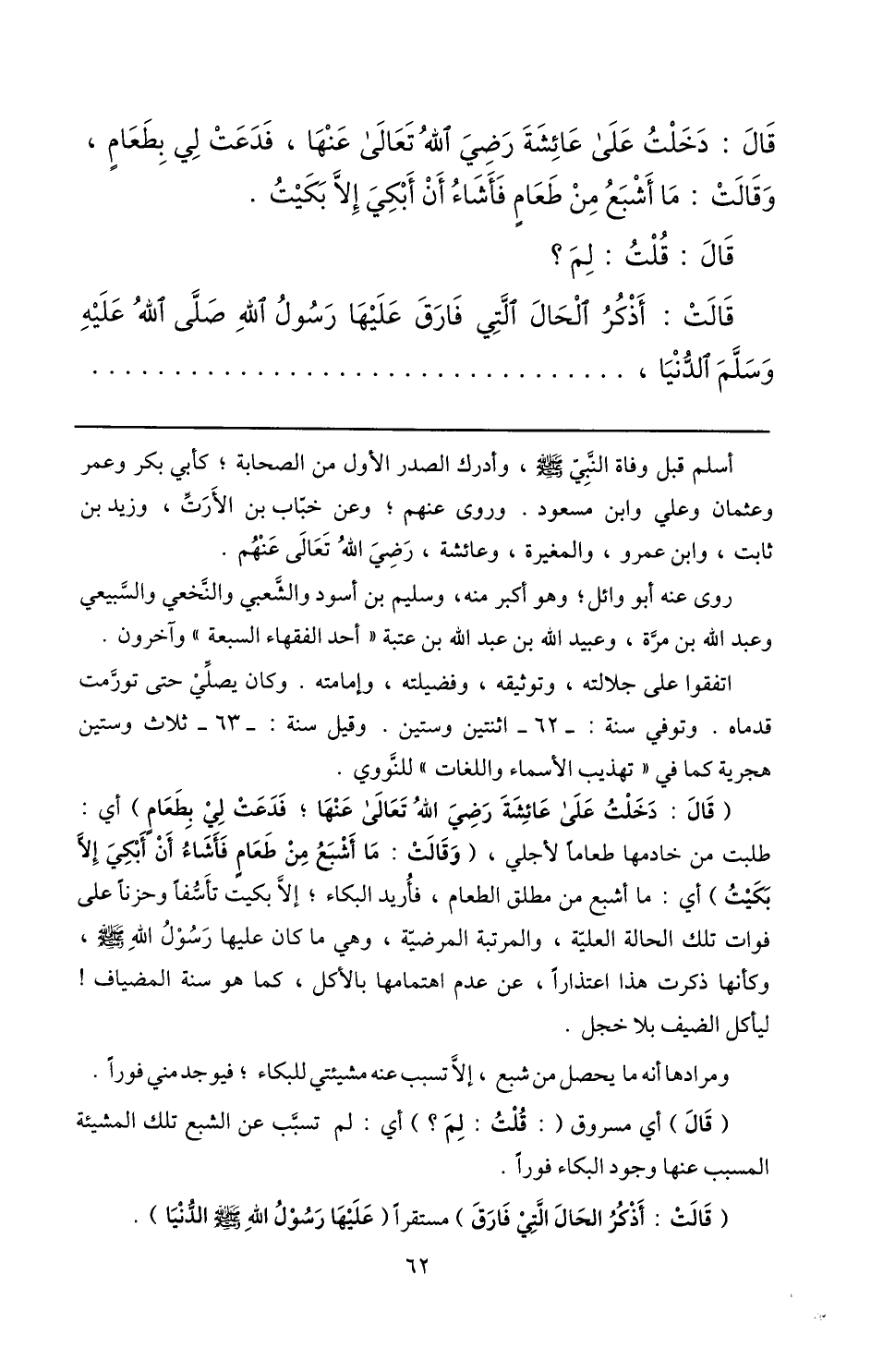 قال: دخلت على عائشة رضي الله تعالى عنها، فدعت لي بطعام، وقالت: ما أشبع من طعام فأشاء أن أبكي إلّا بكيت.